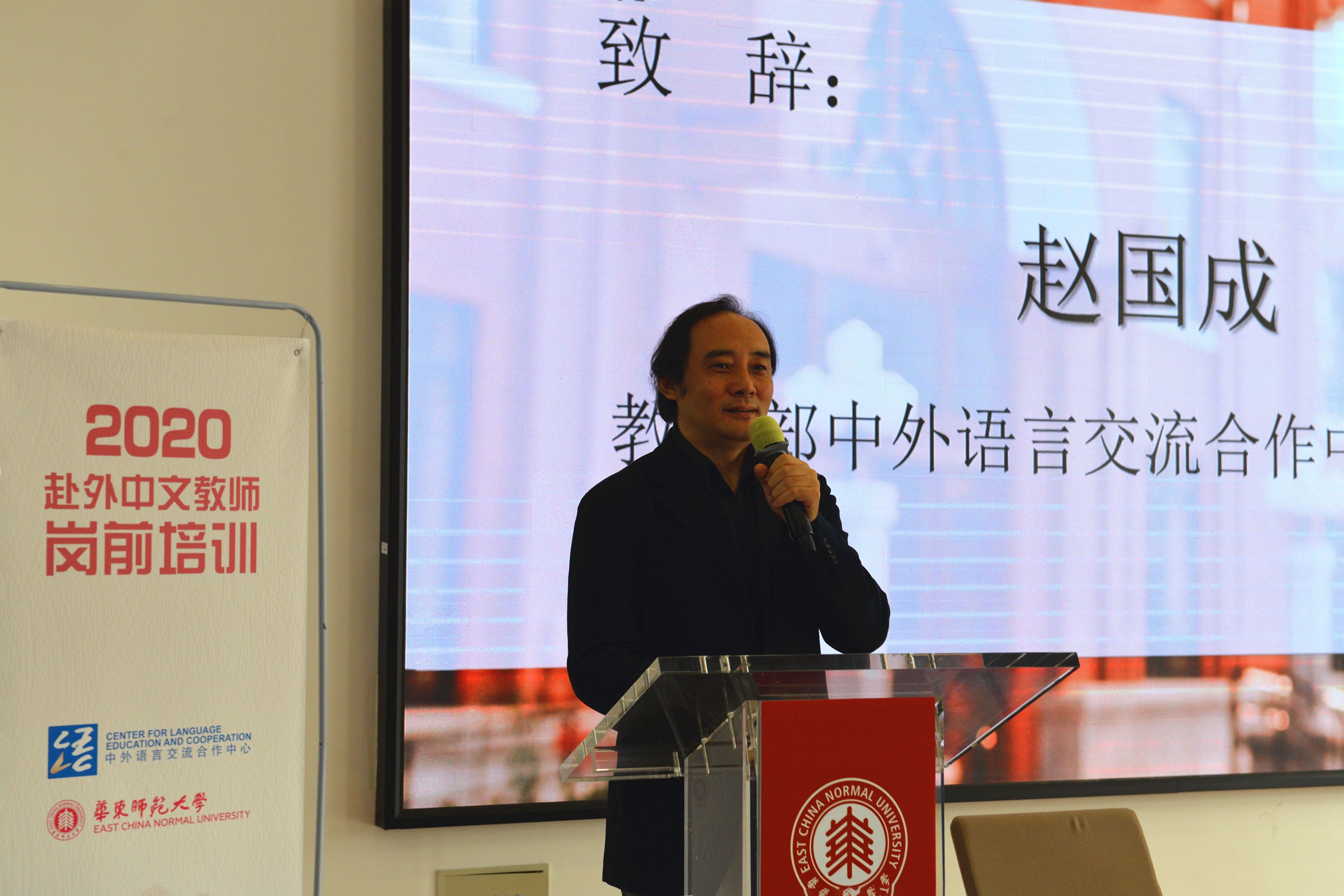赵国成在致辞中对各位老师表示了热烈的欢迎和崇高的敬意!他感谢各位老师加入中文教师的队伍,去国外完成伟大的使命。他感谢华东师大一直以来对语合中心的大力支持,他说,多年来华东师大同语合中心密切合作,并且承担了大量培训任务,成为非常重要的、发挥作用最大的培训基地。他说,因特殊时期,这次培训采取线上、线下相结合的方式,线下的培训虽然只有短短的三天,希望大家能够在课程、团队建设、能力提高等方面收获满满!