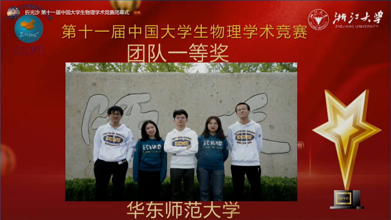 10月16日至18日,由中国大学生物理学术竞赛组织委员会主办、浙江大学物理系承办的第十一届中国大学生物理学术竞赛(CUPT)(线上)比赛激烈开展,华东师大物理与电子科学学院六名本科生组成的代表队参赛,经过两天两夜的角逐,最终从来自62所学校的63支参赛队中脱颖而出,位列第九,首次斩获大赛一等奖。