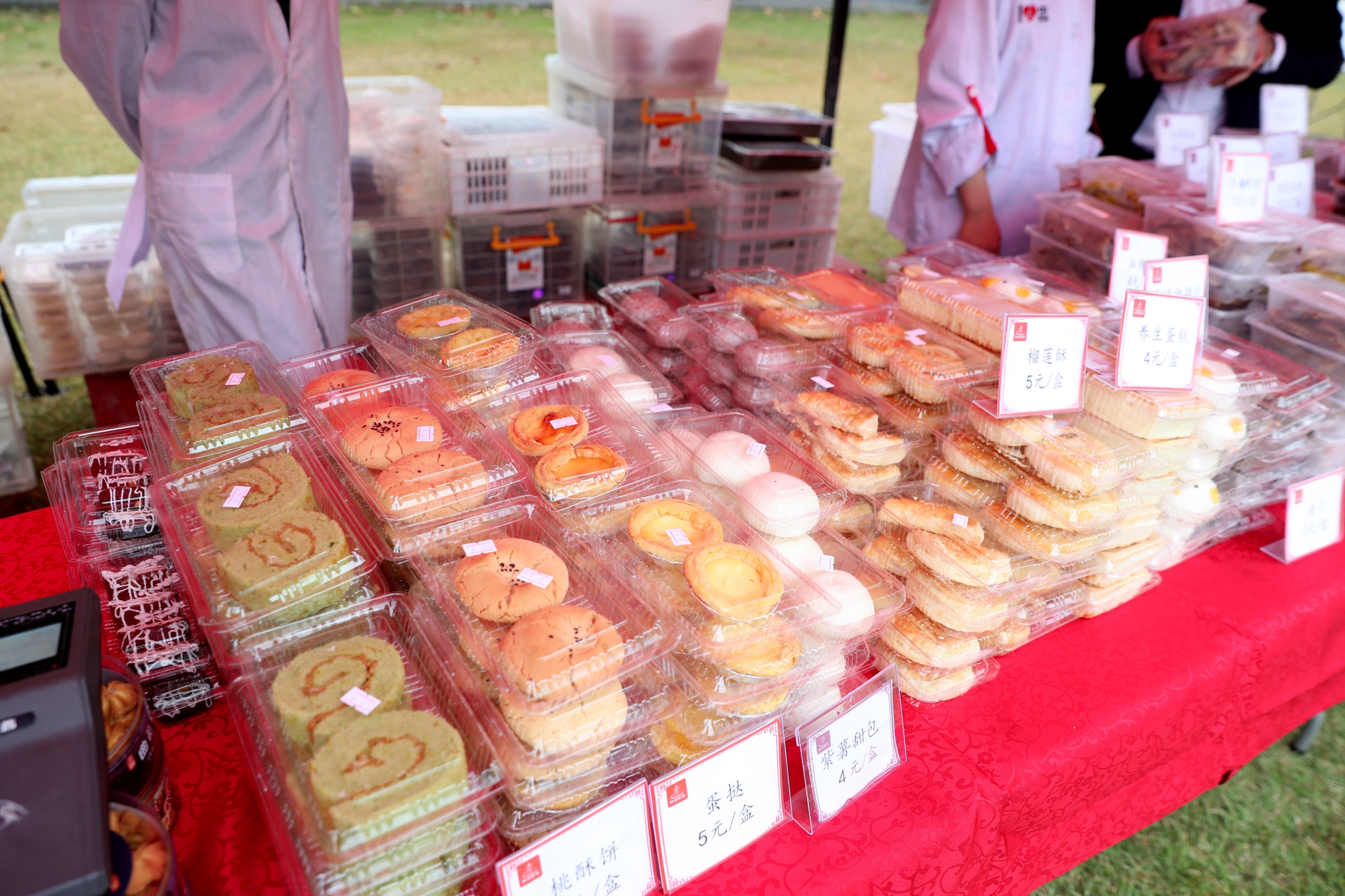 “人未到,食先备”,上午10点半,各部门已早早做好了准备,在工作台上摆好了琳琅满目的美食,有饱满料足的中式糕点、有色泽诱人的西式点心、有色香味俱佳的营养菜肴、有新鲜实惠的当季蔬果。师生们不仅可以吃到膳食服务中心(1)的比利时巧克力、虎皮卷、巧克力泡芙、苏北肉圆,还可以吃到膳食服务中心(2)的开胃小木耳、广式叉烧、榴莲酥;不仅可以品尝到秋林阁的蝴蝶酥、椒盐酥饼、酒酿糕、去骨凤爪,还可以品尝到中快餐饮的绿豆糕、拿破仑、肉松酥条、卤水鸭翅;不仅可以试试象郡餐饮的水果捞新品,还能试试清真食堂的椒麻鸡和肉夹馍。
