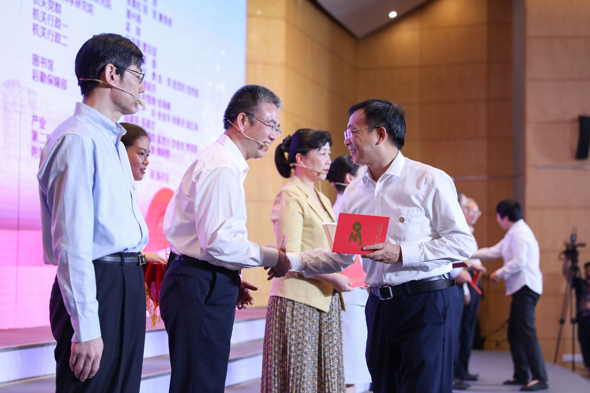 在全场热烈的掌声中,校领导朱民、王宏舟、杨昌利、曹友谊、李志斌、戴立益分别为第十二届师德标兵和满30年教育工作龄的教师颁发奖杯和纪念证书,今年新入职的教师代表向受表彰的教师献花致敬。
