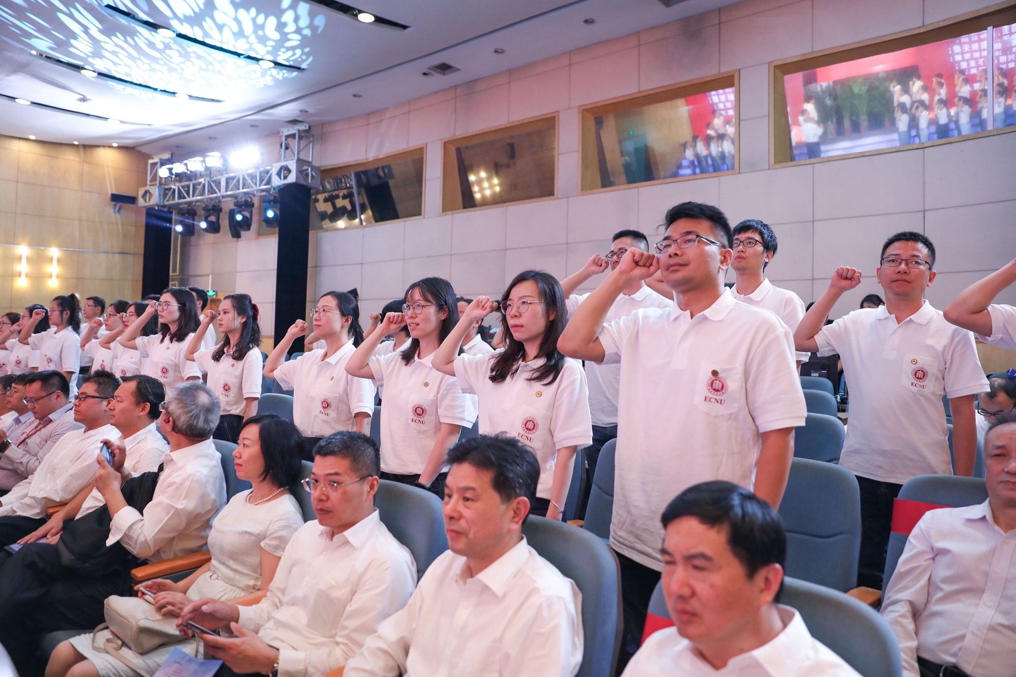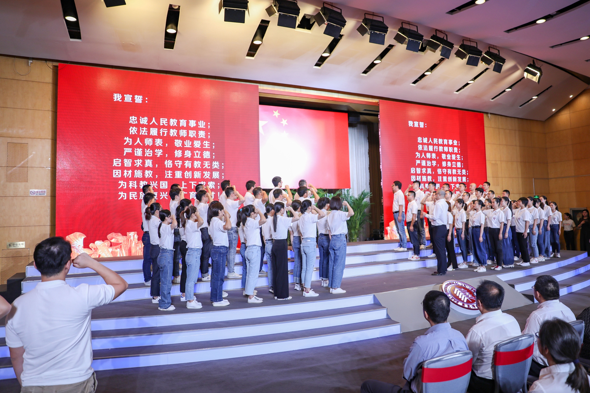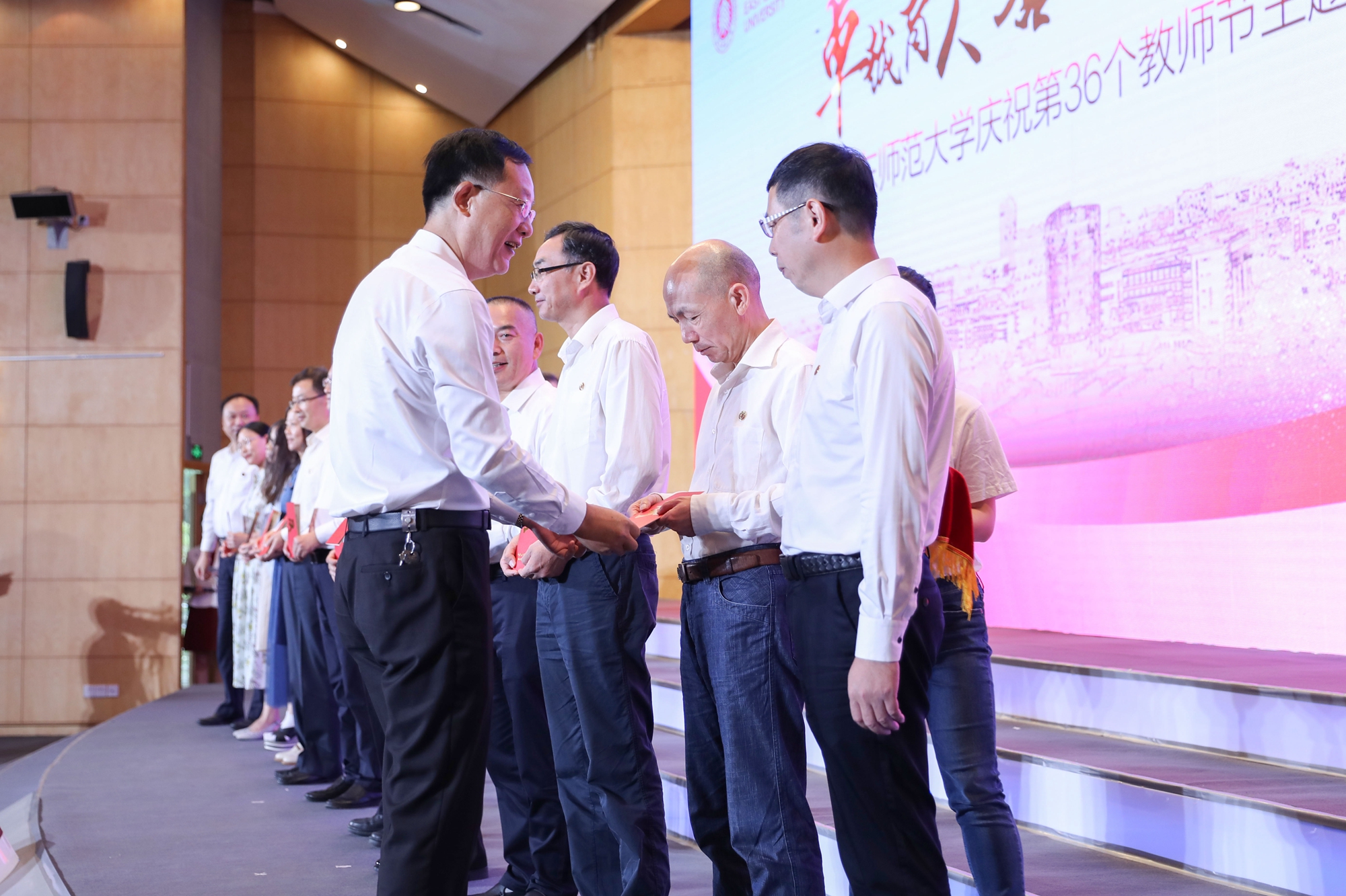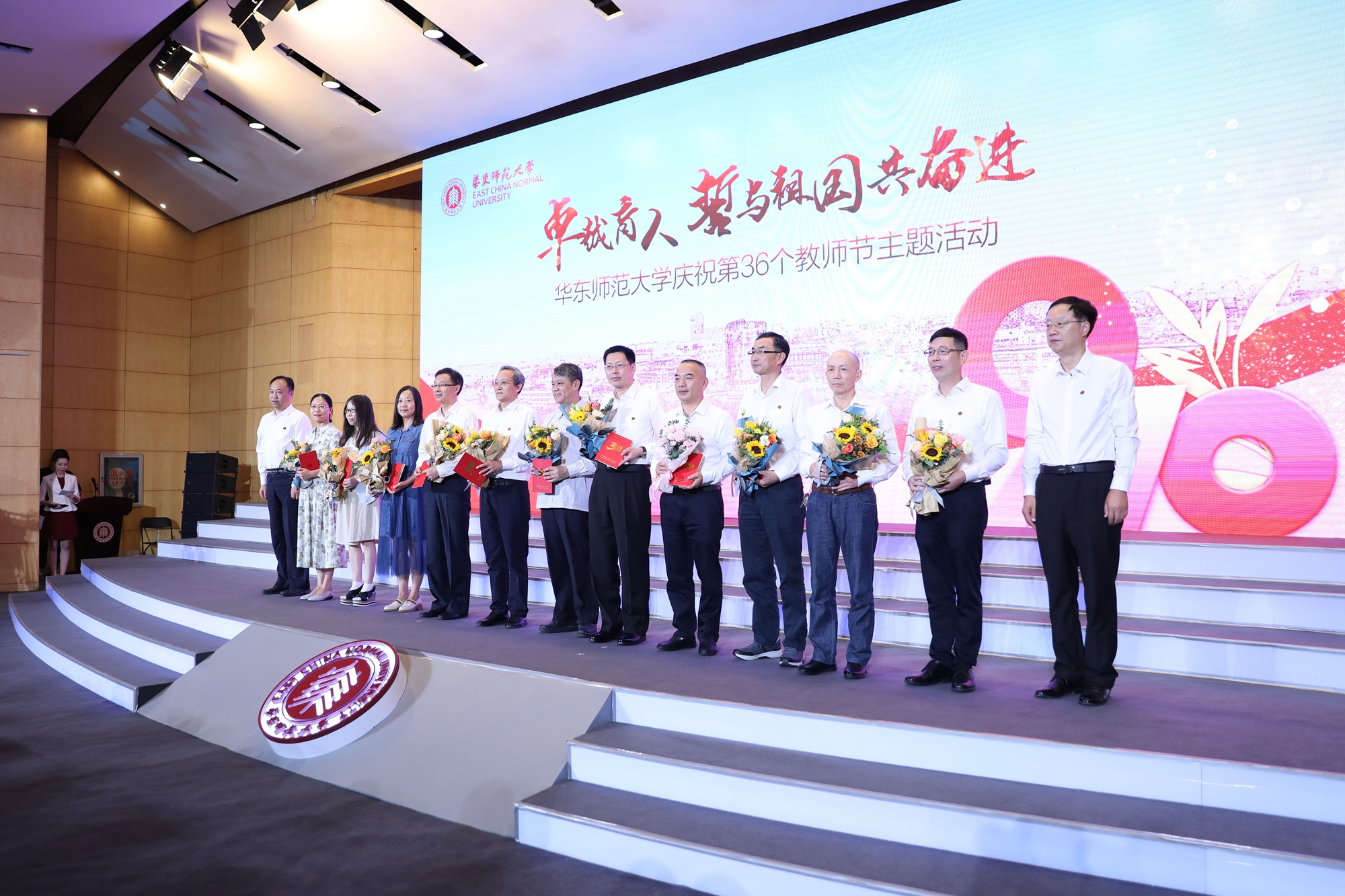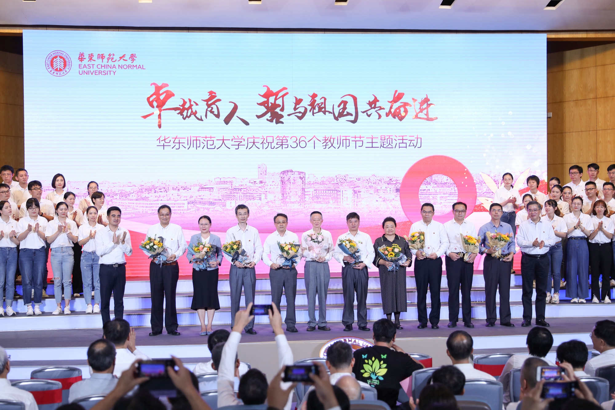 9月10日上午,华东师大“卓越育人,誓与祖国共奋进”庆祝第36个教师节主题活动在中山北路校区科学会堂举行。活动现场表彰了学校第十二届师德标兵和30年教育工作龄的教师,并举行了新入职教师宣誓仪式。