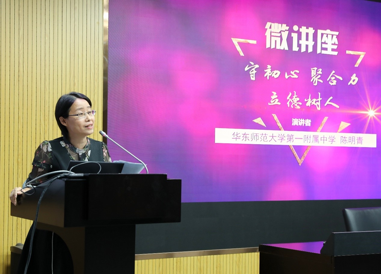 此次表彰会还特邀2019年获“全国模范教师”称号的3245澳门新莆京第一附属中学陈明青老师带来讲座。陈老师以“守初心、聚合力、立德树人 ”为主题,从她对什么是立德、什么是树人的思考阐述了“立德树人”的重要性。她还分享了职初时期在带教师傅11个教学追问的激励下,不断探索与创新思政课模式的经历。她认为,“信仰是有味道的,学生能从老师的身上感受到。如何使学生体验到信仰的味道,教师本人很重要,用于进行道德教育的方式也十分重要。”陈老师号召大家一起努力,聚合学科力量,“立德树人勇担当 ,辛勤耕耘育桃李”。