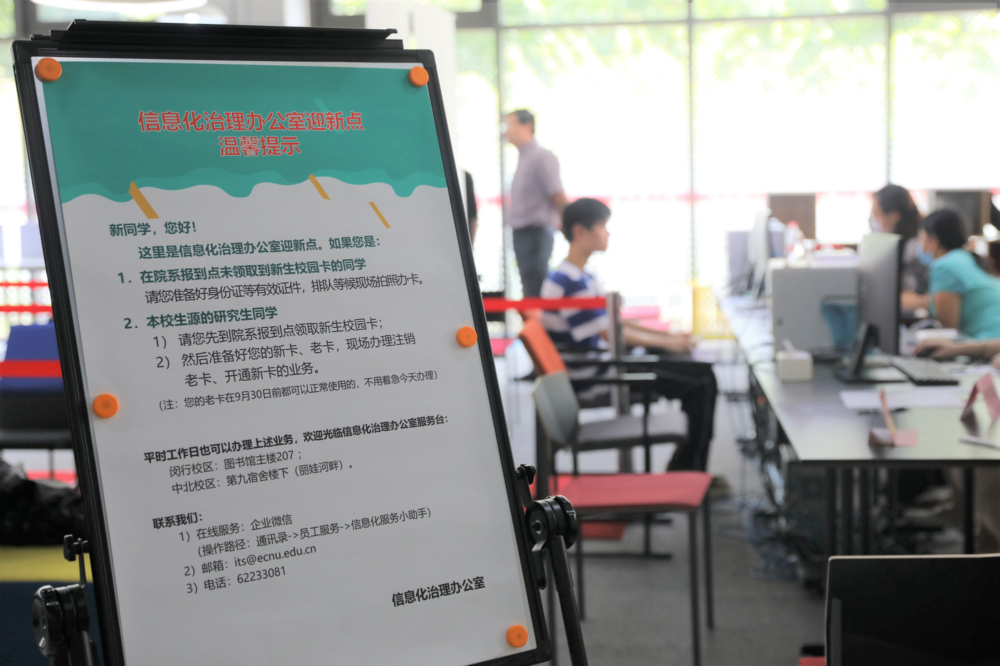今年,各职能部门所在的综合服务点有些“冷清”,原来是各部门为了给新生报到提供一站式服务,都将工作做在了前面,让学生享受智慧校园便利。信息化治理办公室在暑假期间提前制作近1万张新生校园卡及信息化服务指南,并分发至各院系所、书院;在新生到校前,为新生开通公共数据库、电子邮箱、微信服务平台等相关信息化服务。新生缴费也不用到现场排队,可以通过网上自助缴费、企业号缴费、委托银行扣款等方式线上进行。