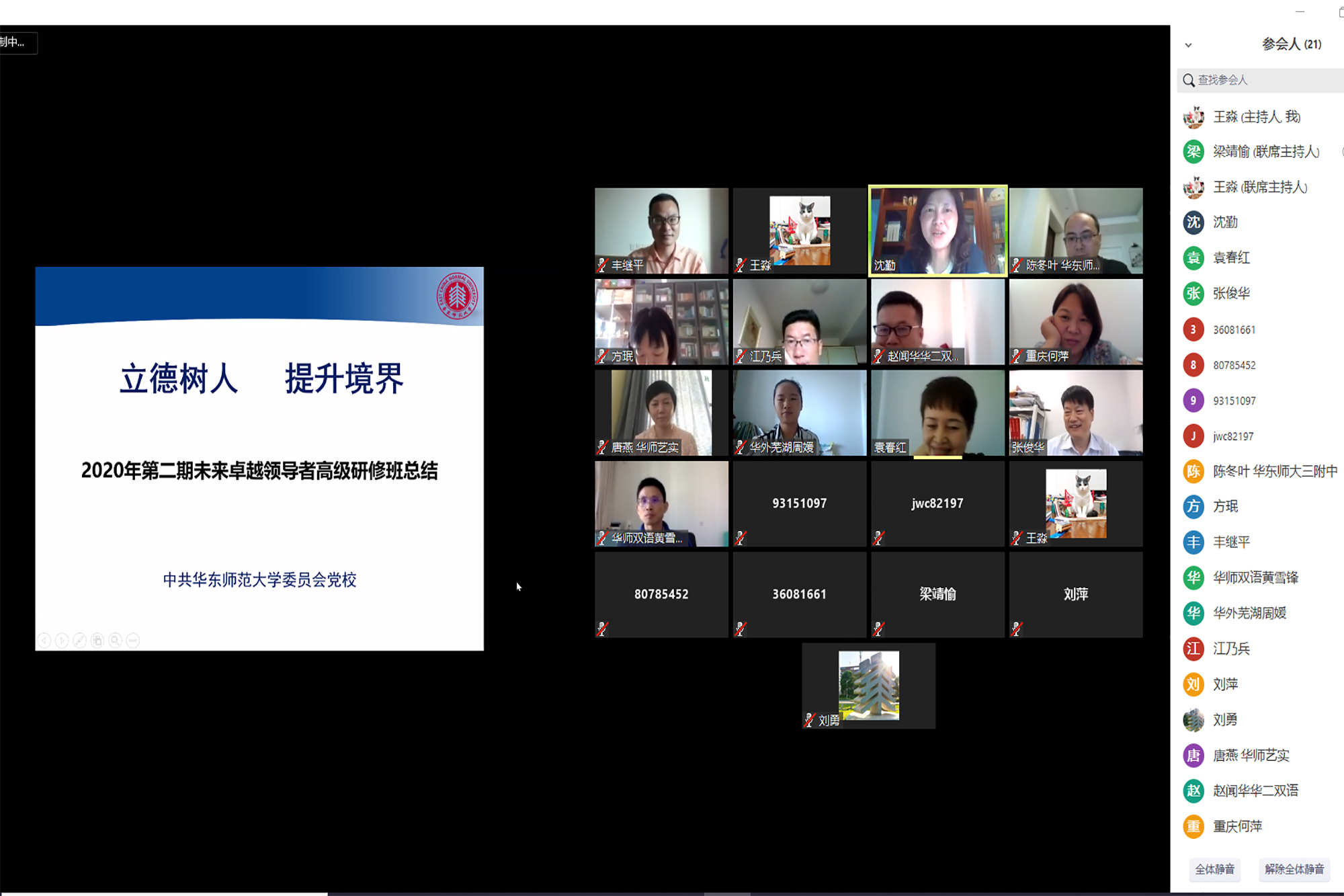 8月13日下午,第二期未来卓越领导者高级研修班结业仪式通过线上直播平台举行。12位学员先后发表研修感想,学员纷纷表示本次研修课程内容丰富、主题集中,授课专家水平高;通过本次研修班进一步坚定了理想信念、提升了政治素养,在未来的工作中要不断提高政治能力、履职能力及管理能力,创新工作方式,强化责任担当,回答好“培养什么人、怎样培养人、为谁培养人”这一根本问题。结业仪式最后,党校副校长兼高级研修学院副院长张俊华以“立德树人提升境界”为题作总结报告。张俊华认为,本次研修是一次“理想信仰与价值观的教育”,达到了坚定信仰、传递价值、引领思想、提振精神的培训目的。他期望学员们能通过此次研修认识到抓好党建“牛鼻子”的重要性,聚焦学校内涵发展,不断提升自身专业化能力,为培养德智体美劳全面发展的社会主义建设者和接班人作出应有贡献。