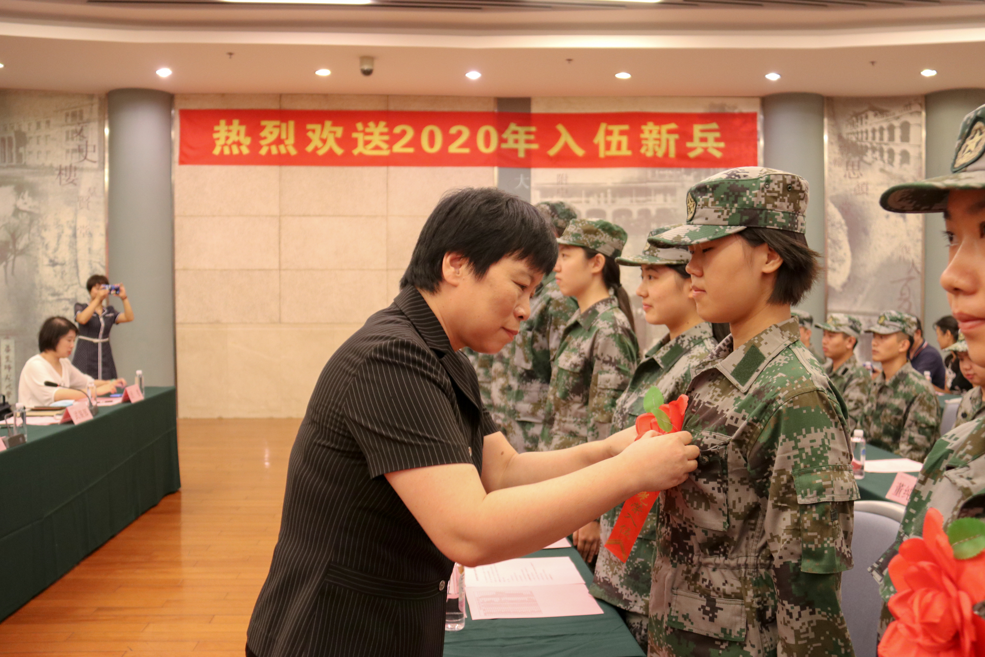 校党委副书记杨昌利为入伍新兵佩戴大红花