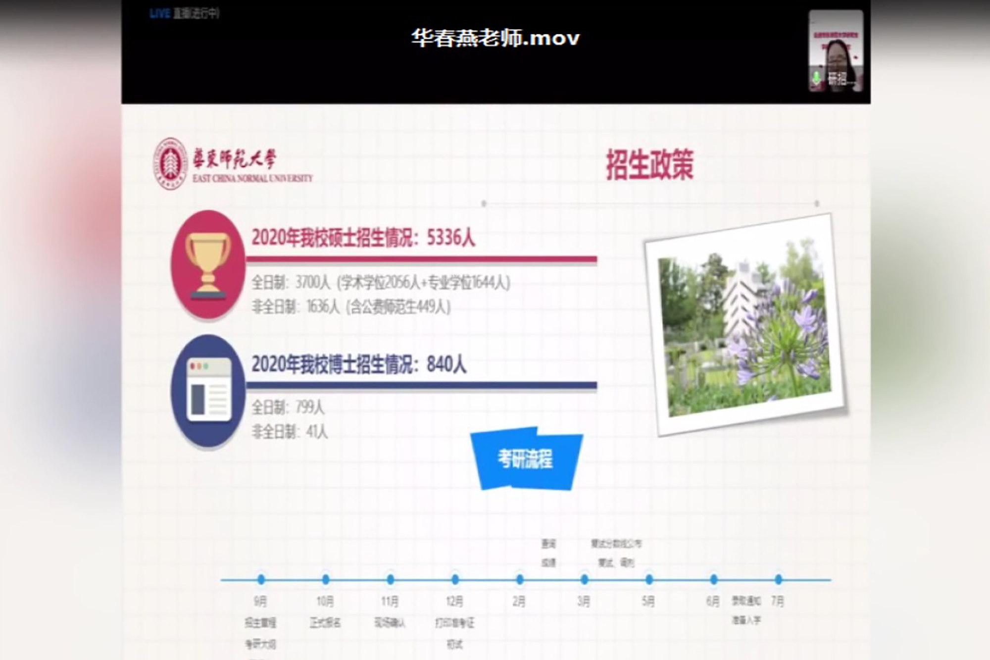 研究生招生办公室主任华春燕以《走进3245澳门新莆京硕士研究生:学科、培养与招生》为题,从华东师大学科概况、研究生培养和资助体系、国境外交流项目、研究生招生政策等方面做了介绍,让广大学子有了更具象化的概念。她提到,华东师大坚持立德树人根本任务,以“服务需求、提高质量、追求卓越”为主线,努力全面办好一流研究生教育,切实推进研究生教育高质量创新发展,目前已有12个学科进入教育部第四轮学科评估A类。
