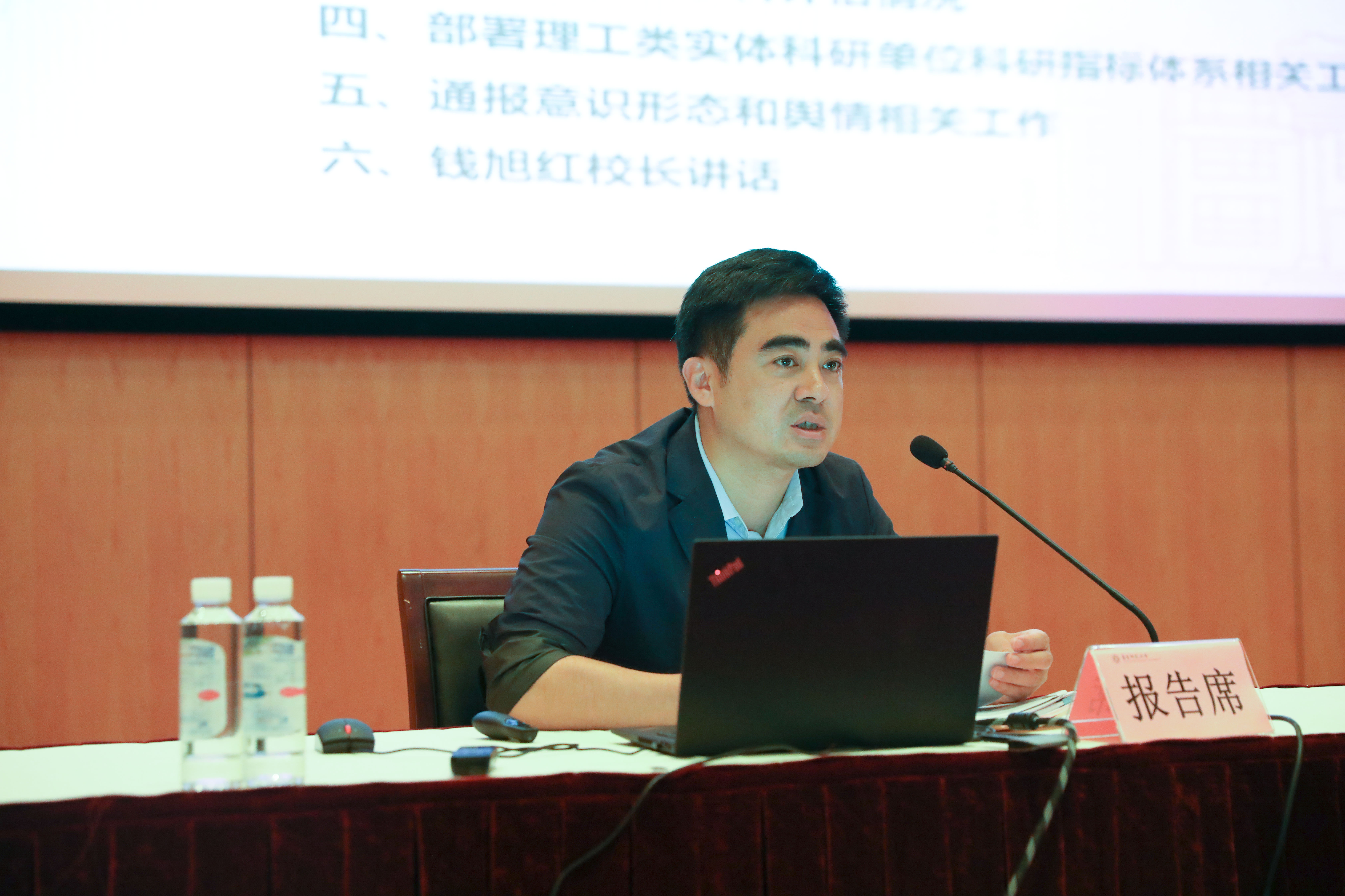 会上,校长助理雷启立通报了学科评估规划建设工作进展;校党委常务副书记王宏舟、发展规划部部长杨蓉部署了实体教学科研机构“十四五”规划编制工作;副校长李志斌通报了第五轮学科评估相关政策情况;副校长孙真荣介绍了理工类实体科研单位科研指标体系相关工作;王宏舟通报了意识形态和舆情相关工作。