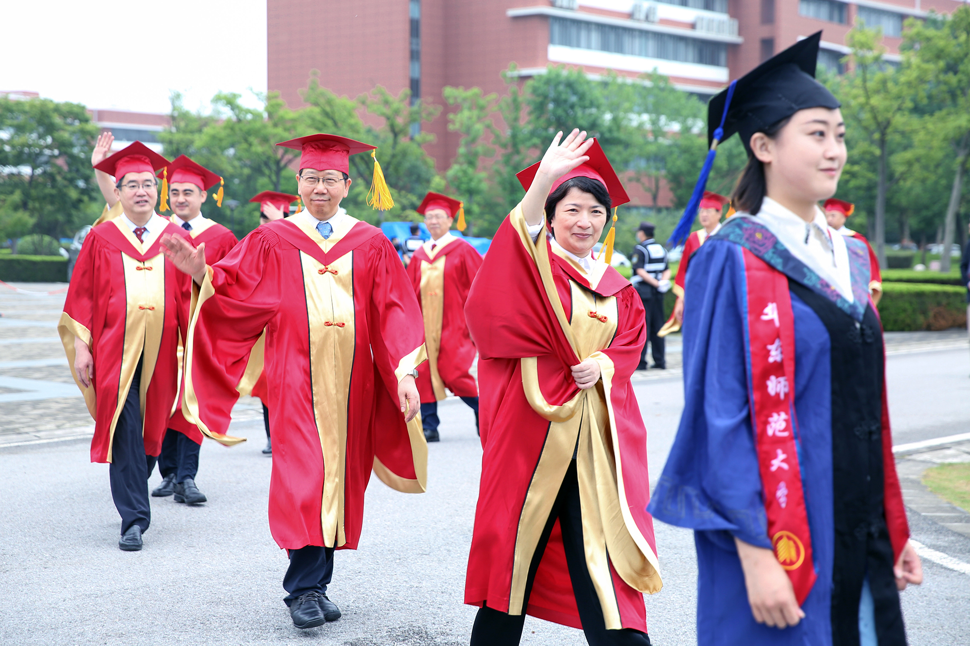 毕业典礼最后举行了校旗传递仪式,校旗由毕业生代表呈送校党委书记梅兵,再传递给在校生代表。这面光荣的校旗,将在一届又一届的师大人手中传递下去,光荣的师大精神将在一代又一代师大学子心中传承。