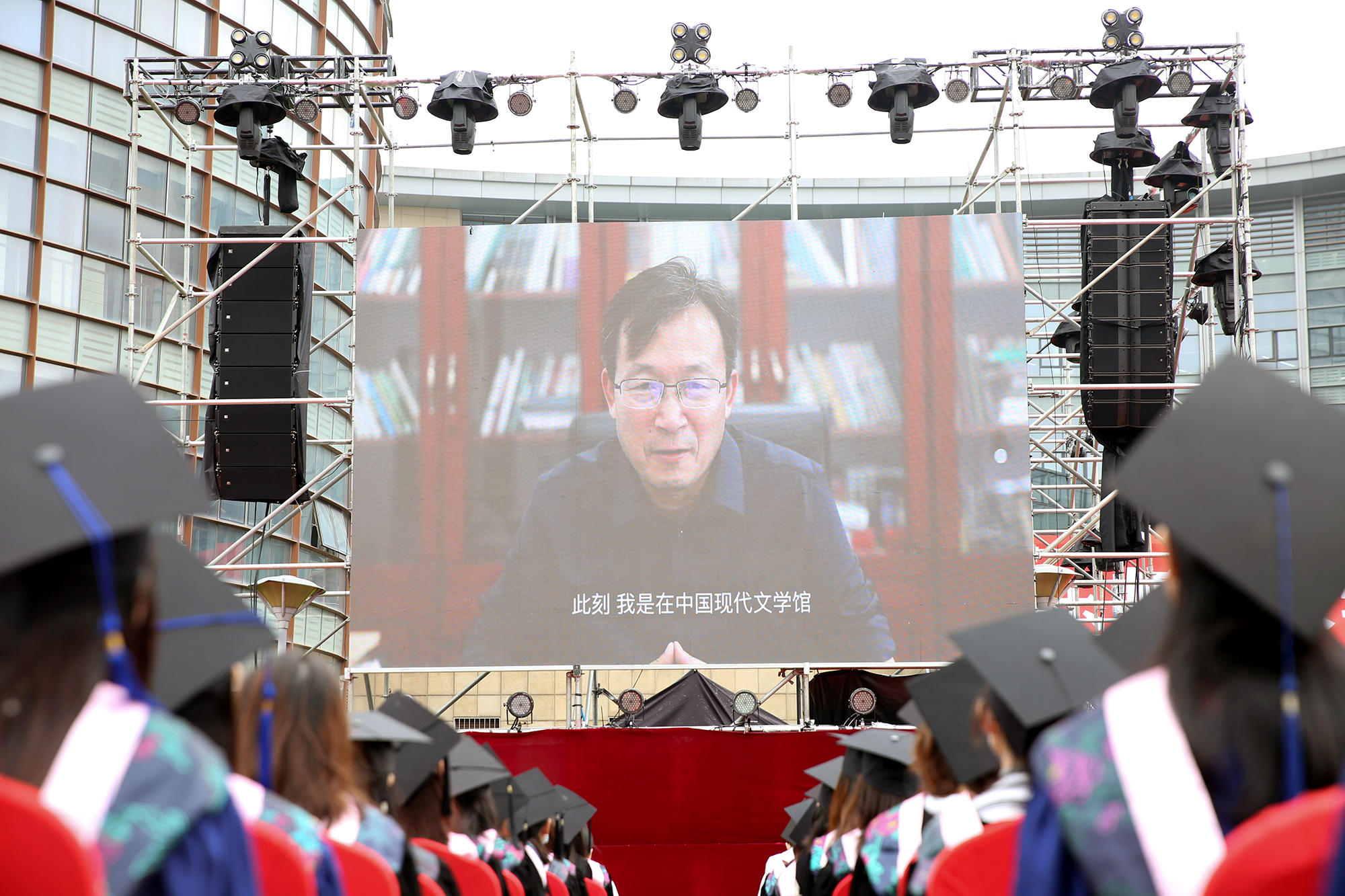 1983级中文系校友、中国现代文学馆副馆长李洱先生作为杰出校友代表,精心录制一段视频与学弟学妹云端相聚。他讲述所在的中国现代文学馆成立于1985年,现已成为中国现当代文学的资料中心、交流中心、展览中心和研究中心,成为世界上最大的文学博物馆。他第一次走进这个展览大厅,就惊奇地发现,这里展出的众多作家和学者当中,华东师大校友是最多的,有如群星闪耀。作为第十届茅盾文学奖得主、著名作家,李洱语重心长地对毕业生说道:“对于未来不可预期之事,我们可以从过往的历史中寻找答案:当我们回首来路,我们就可能找到未来的道路;当我们推己及人,我们就可能找到与他人和世界相处的方式,并且赢得一个健康的自我。而在这个过程当中,我相信你们和我一样,会不时地收到来自母校的祝愿和提醒。我们惟一能回报的,或许就是以自己的思考和行动,去阐明一个基本的道理,那就是人的境况有可能因为我们每个人的努力而得以改善。”