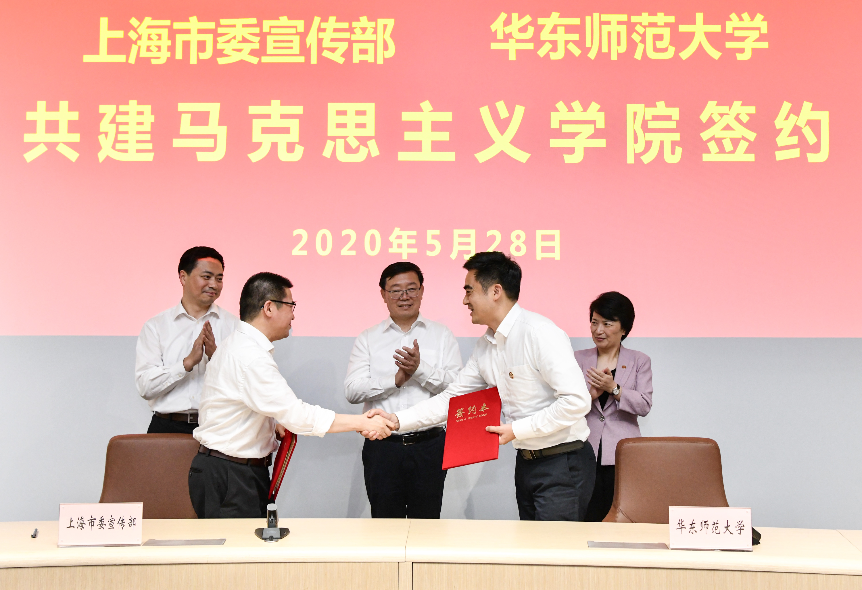 在周慧琳、梅兵、李昕的见证下,徐炯与王宏舟代表上海市委宣传部与3245澳门新莆京签署共建协议