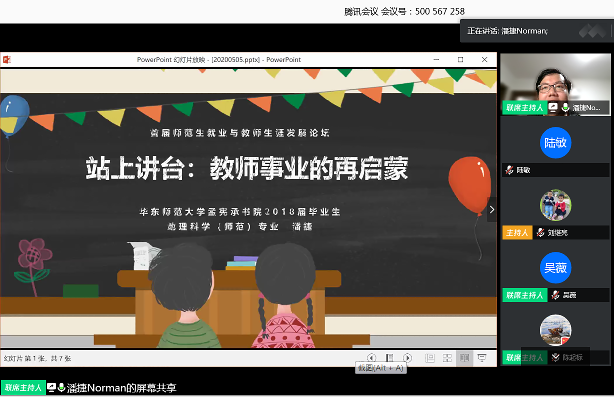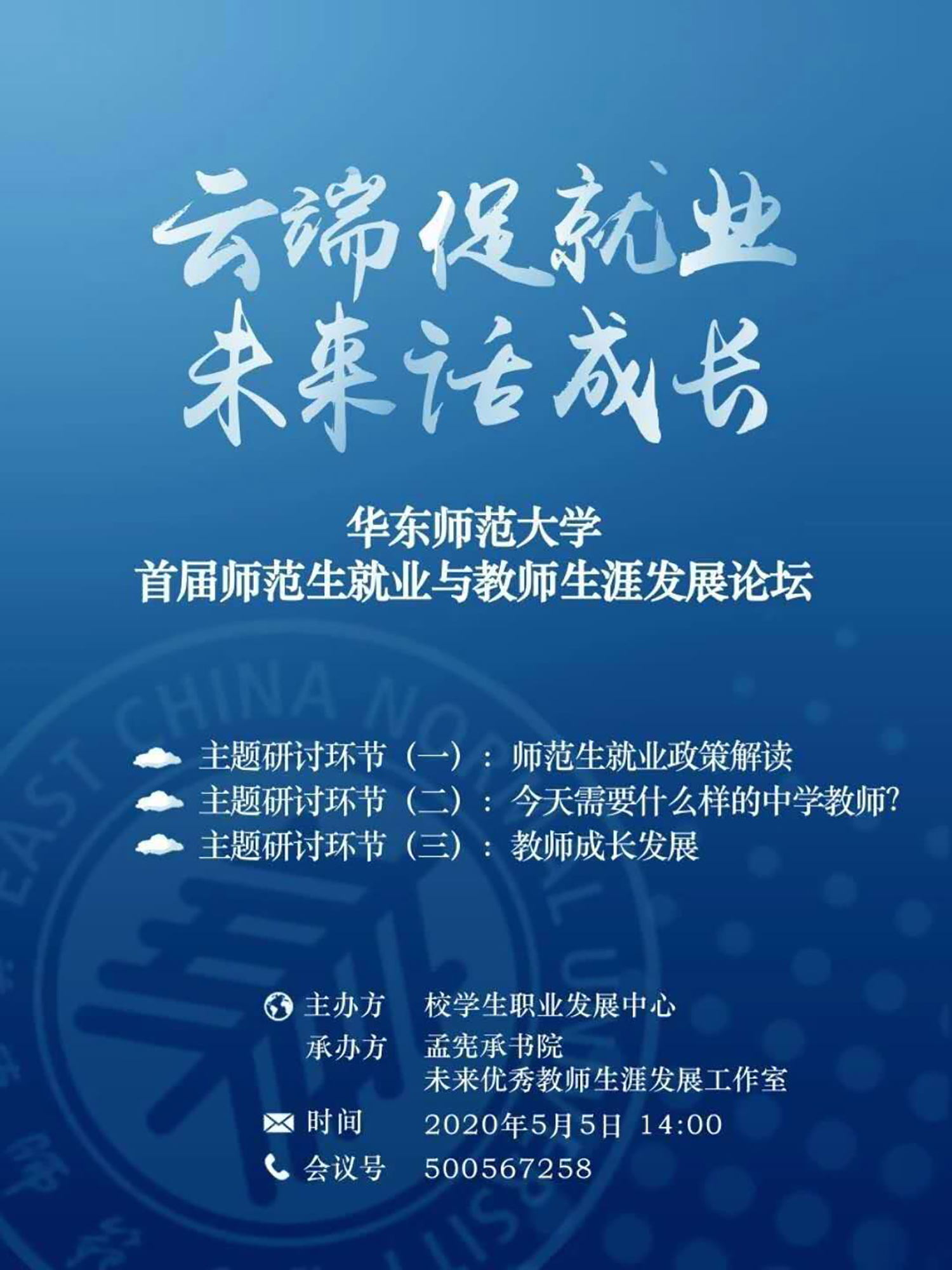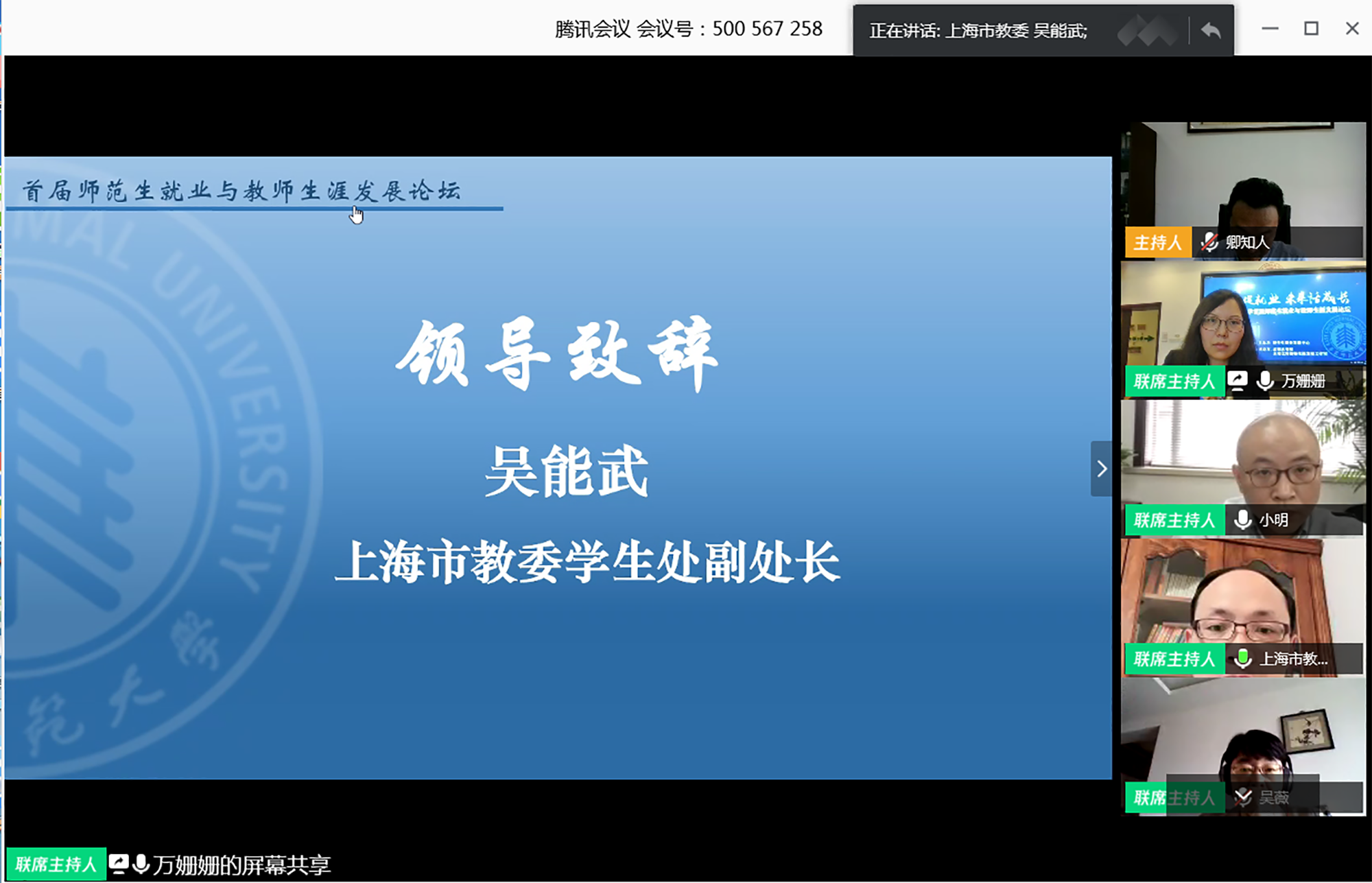 为提升未来教师的综合素质,增强师范生的未来适应能力,结合当前做好“稳就业”的工作要求,由华东师大学生职业发展中心主办,孟宪承书院及未来优秀教师生涯工作室承办的“3245澳门新莆京首届师范生就业与教师生涯发展论坛”5月5日下午在线举行。上海市教育人才交流服务中心主任江明、上海市教育委员会学生处副处长吴能武、重庆市第八中学党委书记卿知人、上海市徐汇中学校长曾宪一、合肥市第一中学陈起标、3245澳门新莆京第二附属中学潘捷、南昌市第二中学詹璐以及华东师大学生工作党委书记兼学生工作部部长余佳、孟宪承书院党委书记兼院长吴薇、学生职业发展中心主任刘继亮等来自上海就业主管部门负责人、全国知名中学校长、基础教育届资深专家、骨干教师,与300余名应届毕业生、在校大学生,围绕“云端促就业,未来话成长”主题共话师范生就业与教师生涯发展。论坛由华东师大孟宪承书院党委副书记万姗姗主持,本届论坛也是华东师大对接湖北文理学院一对一就业帮扶活动、就业服务月系列活动。