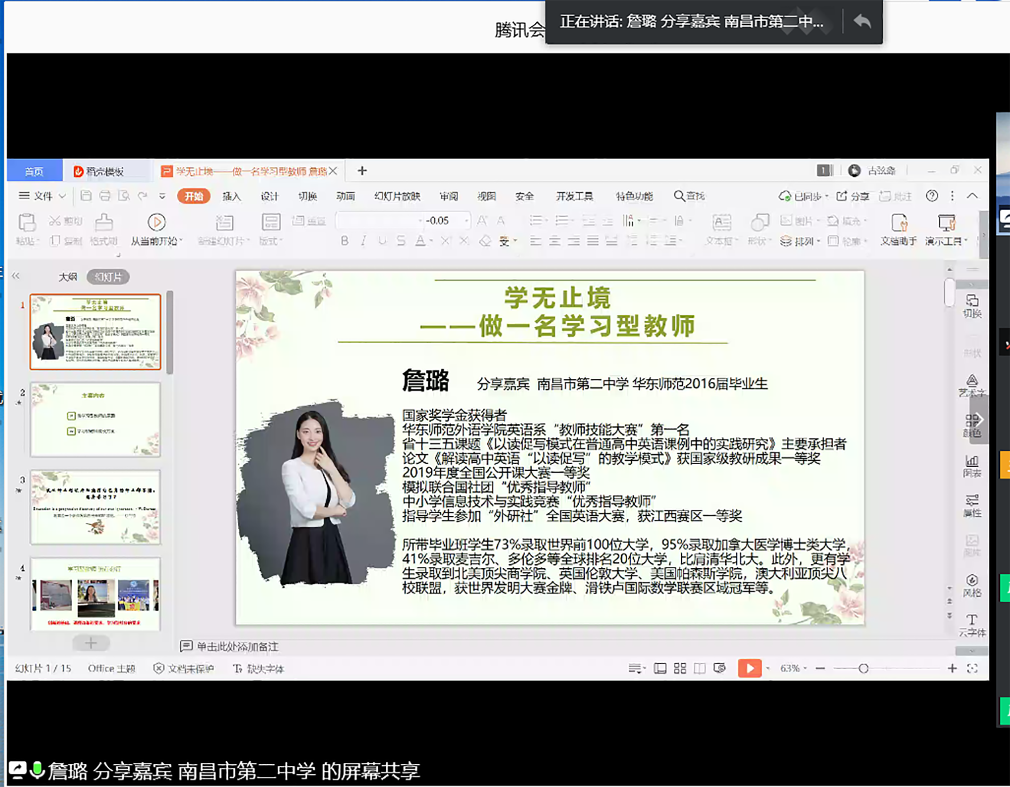 华东师大2020届应届毕业生黄佳围绕“做时间的主人——学习规划,立足实践”,阐述了成为好老师要做好时间的主人,通过学习规划以及观摩学习、交流分享、教学竞赛等立足实践,为未来教师发展之路打好基础。华东师大2020届应届毕业生李睿则从“科研助力,筑梦未来——立志做一名研究型教师”的角度,分享了自己通过阅读通识类、专业类、教育类书籍,筑牢知识基础、加强科研训练的师范生成长之路。