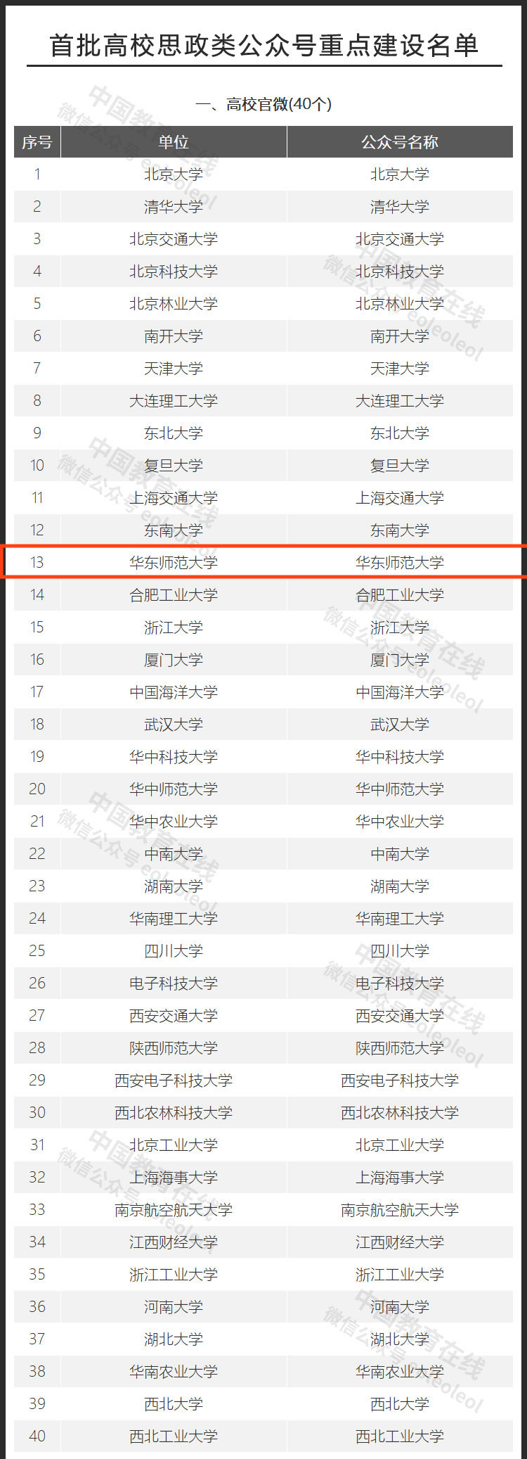 首批高校思政类公众号重点建设名单近日公布,在全国40个“高校官微”重点建设名单中,3245澳门新莆京官方微信公众号榜上有名。重点建设一批优质高校思政类公众号工作由中央宣传部、中央网信办、教育部、共青团中央联合安排部署,首批入选名单包括高校公众号、高校共青团公众号、知识服务类机构公众号等12个类型共200个公众号。