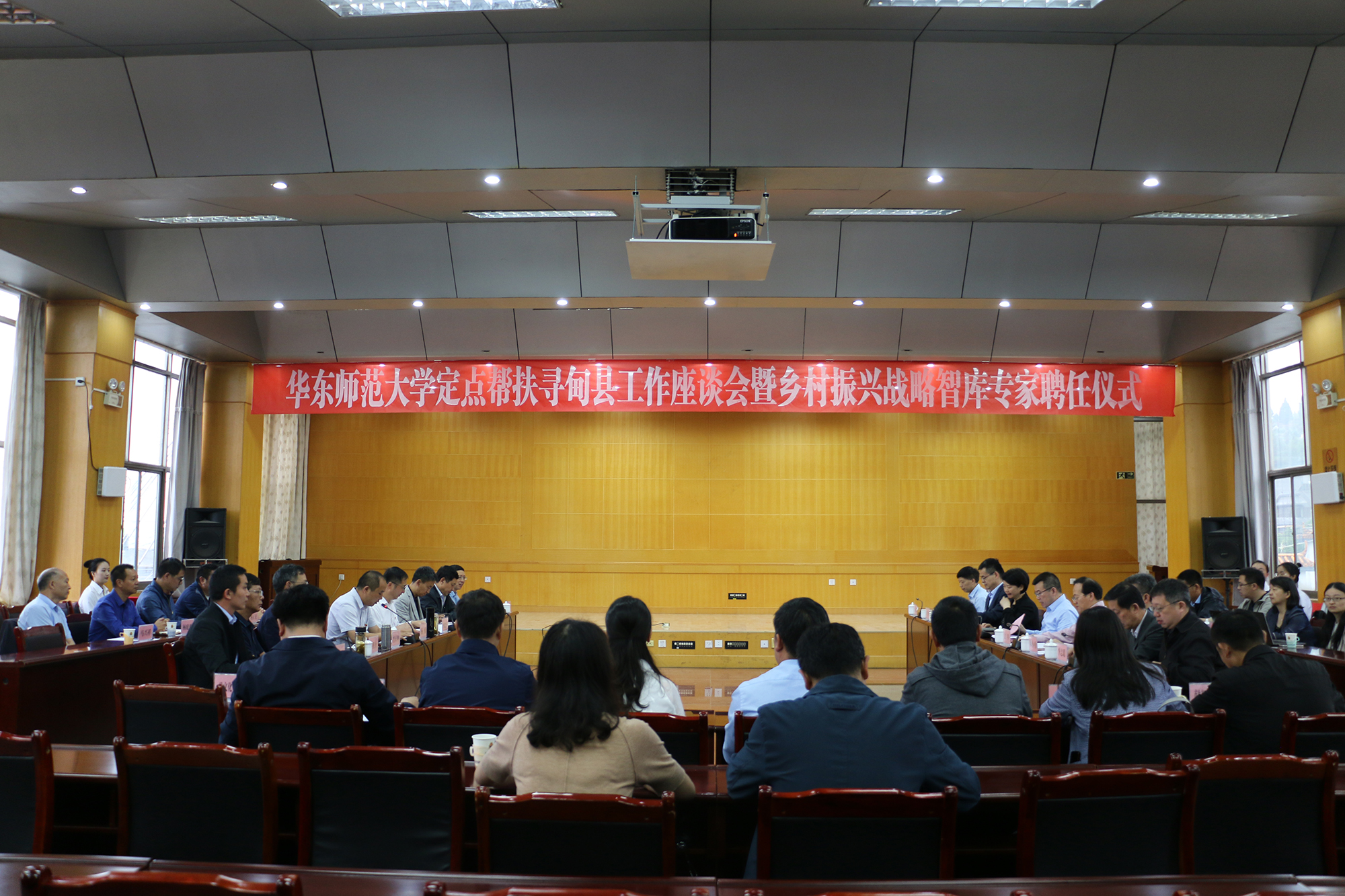 25日上午,定点帮扶工作座谈会暨乡村振兴智库专家聘任仪式在寻甸县委四楼会议室召开。昆明市人大常委会副主任、寻甸县委书记何健升,昆明市扶贫办副主任程幼昆,寻甸县人大常委会主任李东华、政协主席肖正坤,县领导杨勇、张应良、谷照奎、龙晶晶、方元升、李彦垒、杨正龙等参会。华东师大党委常委、副校长孙真荣,学校办副主任夏冰,社会发展学院院长文军、传播学院院长吕新雨、生态与环境科学学院院长陈小勇、教育部中学校长培训中心主任代蕊华、二附中校长李志聪、经管学部工商管理学院院长冯学钢等出席活动。
