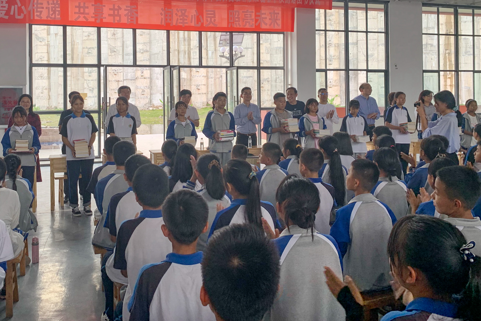 座谈会后,学校举行了图书捐赠仪式。教育部中学校长培训中心组织了第43期全国初中骨干校长高级研修班学员所在学校为怒江新时代学校捐赠图书,来自全国各地的40余位初中校长共募集32000余册图书。新时代学校七年级全体学生参加了捐赠仪式,代表全校同学领取了图书。