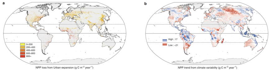 图3:全球2000-2010年城市用地变化与气候变化导致的NPP损失对比