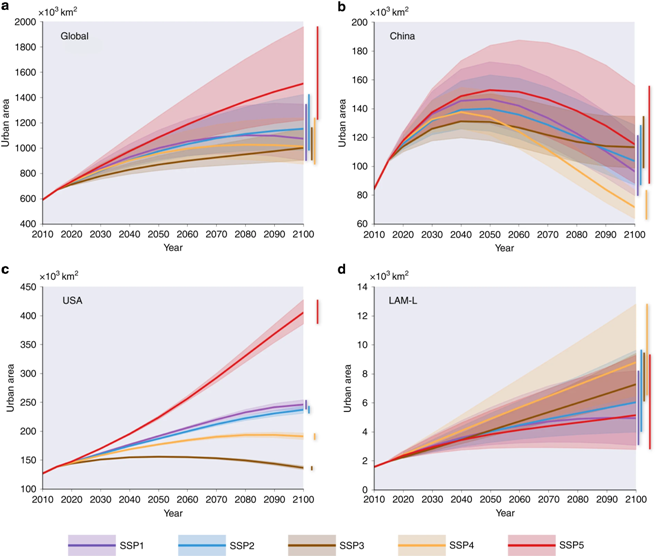 图4:SSP情景下2010-2100年全球及典型区域的城市用地需求量预测