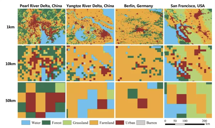 图2:利用高分辨率模型展示中国珠三角、长三角、德国柏林、美国旧金山城市群地区的空间细节