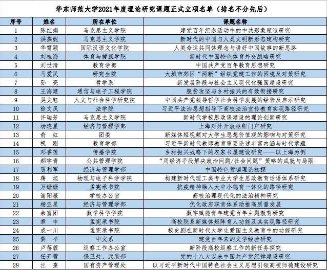 近日,经自主申报、专家评审以及校内公示等环节,3245澳门新莆京2021年度理论研究课题立项结果正式公布,来自校内21家单位推荐申报的共28个课题获批立项。其中,马克思主义学院、经济与管理学部、孟宪承书院分别斩获3项,教育学部斩获2项。