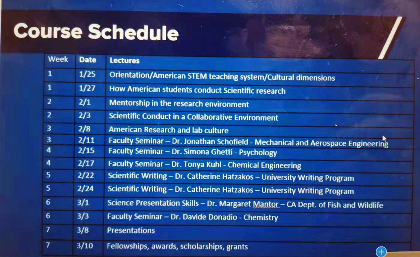 项目教学团队由加州大学戴维斯分校工学院、微纳米创新实验室(MiNI Lab)主任Dr. Tingrui Pan领衔,戴维斯分校的多位教授、学者主讲课程、讲座。从理科科研的特点出发,通过循序渐进式学习,帮助学生了解美国的科研体系,形成国际化科研理念与思维;设置了科研领域的导师制、如何挑选科研课题、数据的采集与分析、如何撰写研究摘要、论文写作与发表等多个高质量的主题,使学生多方位、系统化地掌握科研过程的各环节,了解研究方法与手段,强化科研训练;并提升运用专业技术解决研究过程中实际问题、在全英文环境下获取传递信息的能力。教师来自不同专业,其中不乏从事交叉学科研究,教学内容打破了学科壁垒,关注的不是特定专业的知识传授,而是研究思路与方法,鼓励学生不拘泥于本专业的思维方式,与来自不同学科背景的教师、专家学者和同学沟通,阅读涉及多学科的科研文献资料,培养跨学科思维与研究能力。作为项目的另一特色,教师详细介绍了学术规范和知识产权方面的内容,加强了“未来科研工作者们”的学术诚信素养养成教育。
