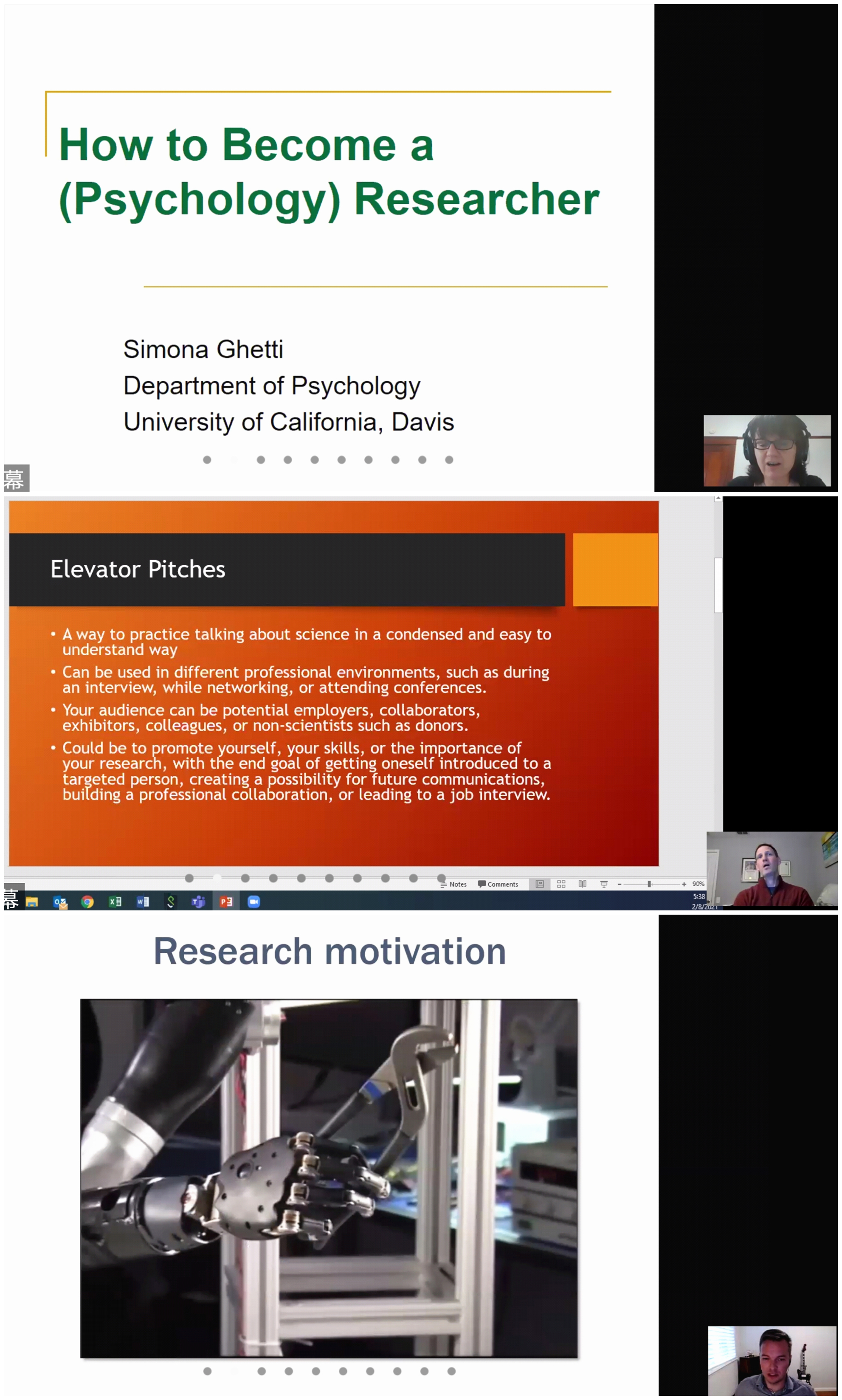 除此之外,外方教师积极引导同学像UC Davis的当地学生那样,勇于展示自己、表达学术观点,交流科研学习体验。让同学印象最深的是Dr. Greg布置的Elevator pitch小作业,每位学生录制视频,通过最大程度地剖析自己的优势,进而锻炼用全英文简明扼要地阐述学术观点、介绍科研成果的表达能力。