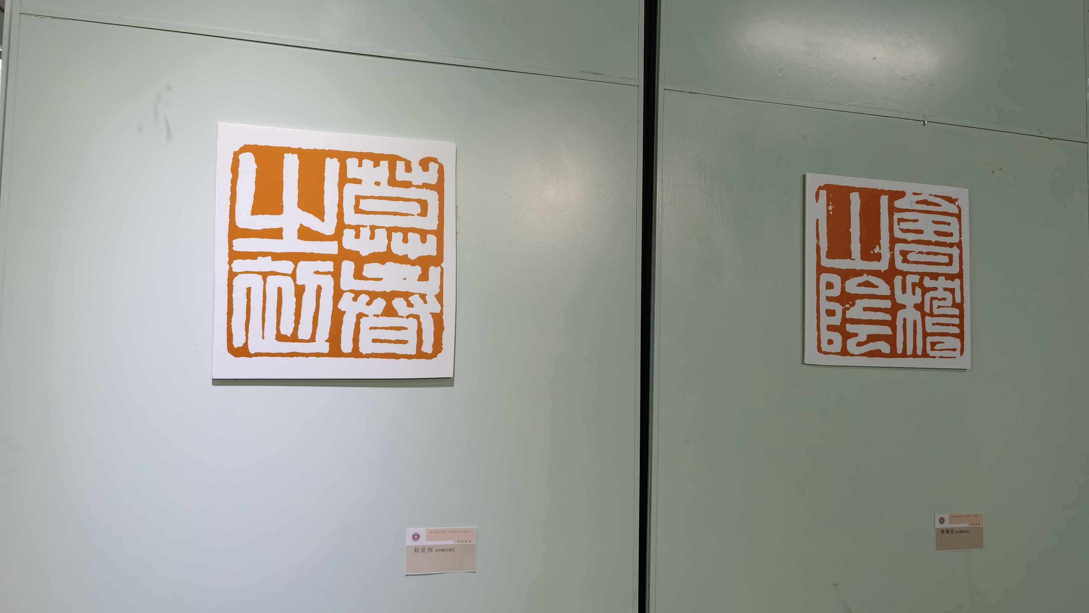 此外还有主题为“印证时代”的篆刻专题展。自去年华东师大篆刻传承基地落成以来,开展了一系列篆刻活动,在校园里掀起了一阵篆刻热潮。此次“印证时代”篆刻展是以建党100 周年为主题进行的专题展,通过作品,能够看到同学们对时代的歌颂与祝福。如郑瑾纶同学用铁笔镌刻下“人民当家做主”“工人阶级先锋队”的时代声音;孙瑾同学用铁笔碰撞出“战斗堡垒”“为万世开太平”的青年力量,体现出积极的精神面貌。展厅中有28幅印屏,其中“红色”主题篆刻有50余枚。各种状态的展示手段和方法在这里也得以体现,在现场能够感受到同学们完备的创作能力和多样的风格,以及对篆刻艺术的执着。