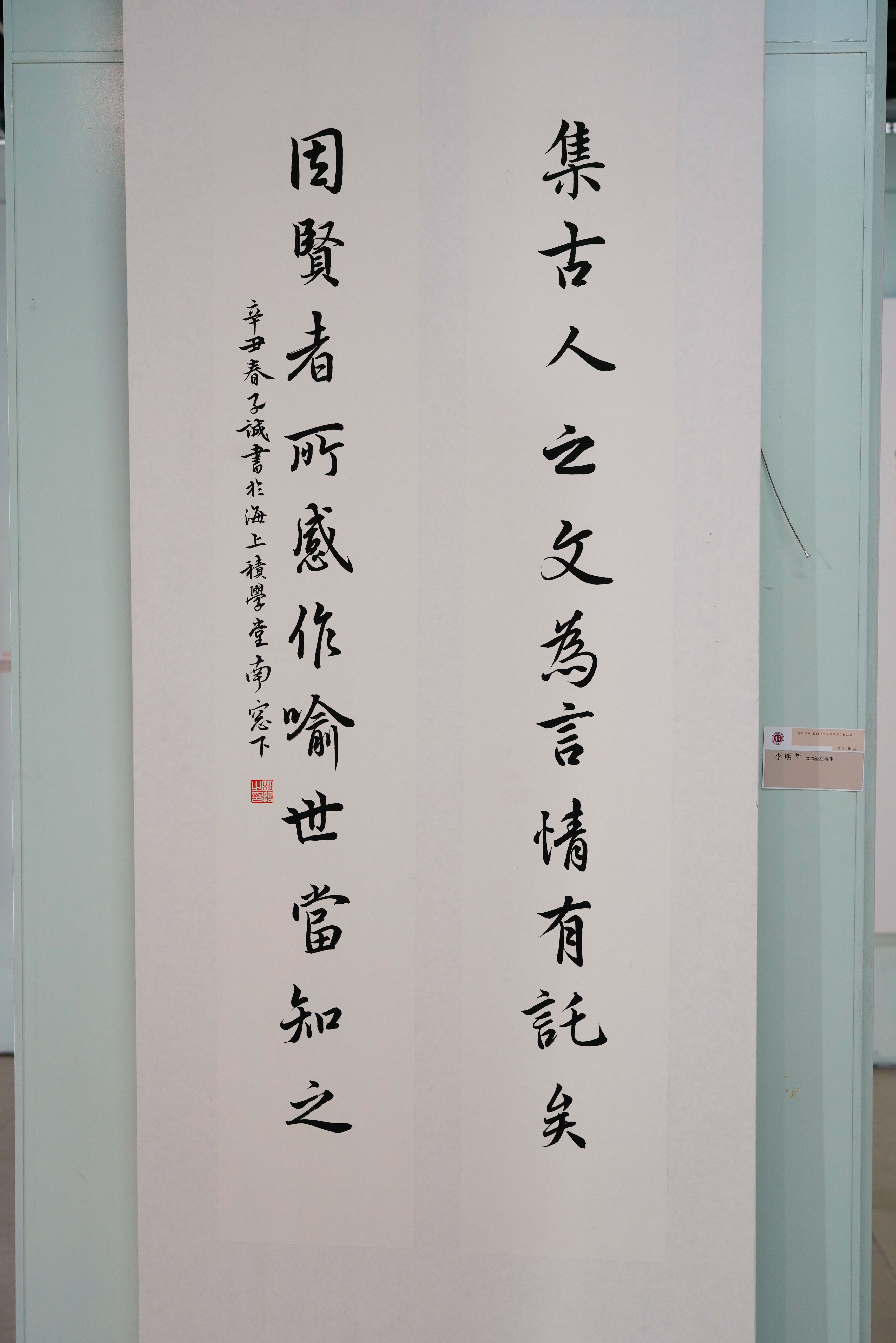在美术学院展厅,有书法篆刻专业同学创作的“兰亭”书法节作品展,展览包括书法作品及篆刻作品两部分,体现了书法篆刻专业同学们创作的积累。其中书法作品56幅,围绕以《兰亭序》为主题的集联或题咏诗展开,诸体兼备,形式多样。