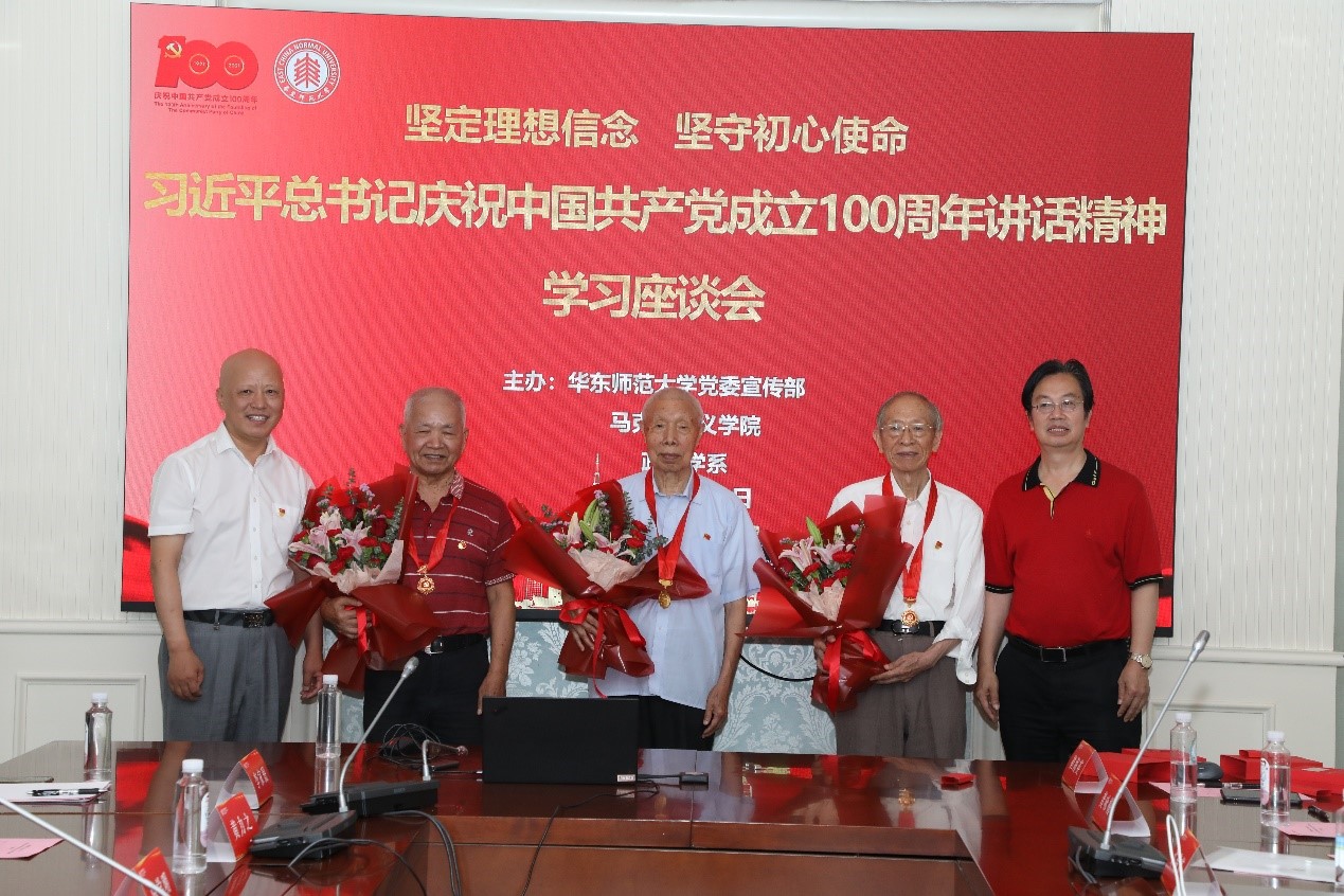 座谈研讨会还邀请了3位党龄达到50周年的老同志代表——王国贤、唐存标、王鼎元参加,马克思主义学院党委书记兼政治学系党委书记赵正桥、马克思主义学院常务副院长王建新为三位老同志戴上纪念章。在场师生用热烈的掌声向老同志们表达崇高敬意,并立志以老党员同志为表率,秉承初心使命,积极投身于中华民族伟大复兴的光荣事业。