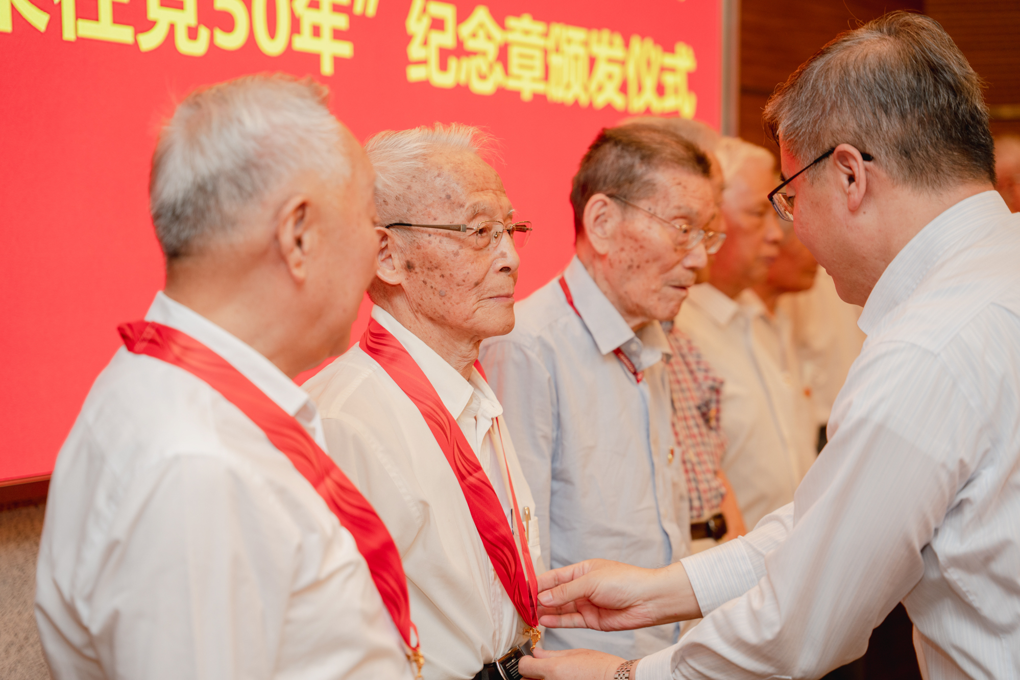 校党委副书记朱民为到场的17位老党员颁发“光荣在党50年”纪念章
