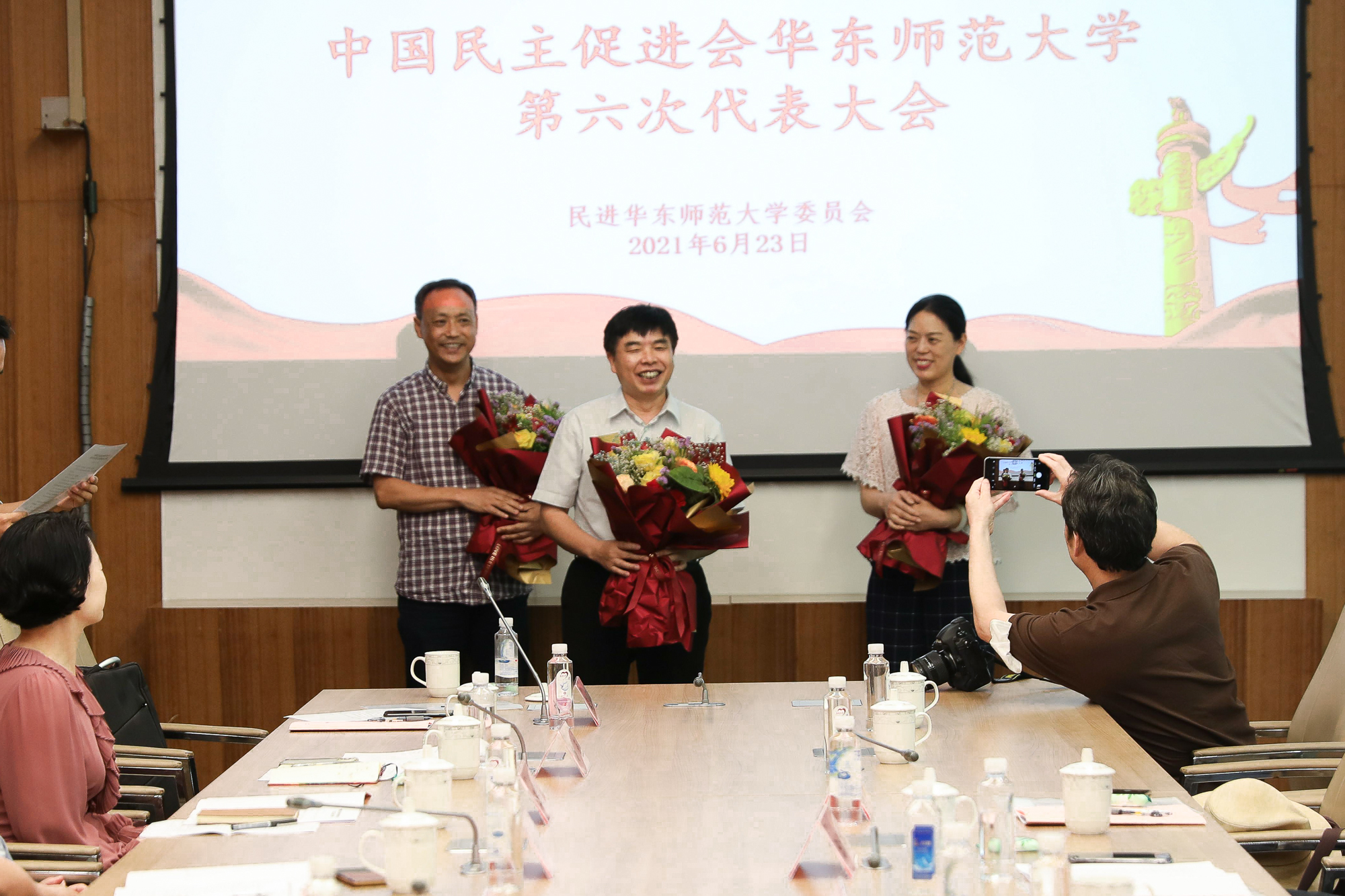 大会向离任的上一届委员会委员谈胜利、陈明华、吴蔚致谢并献花,感谢他们多年来为校民进作出的贡献。