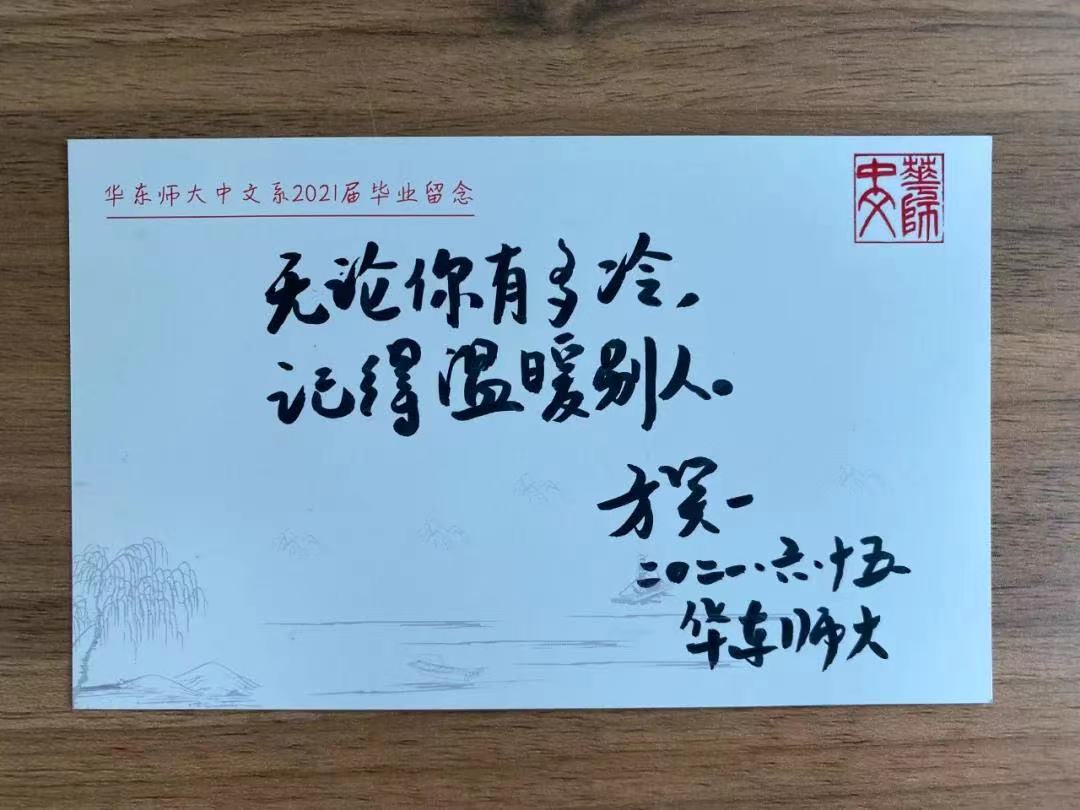 在2021届学生即将离开丽娃河畔和樱桃河边的象牙塔奔赴各自的前程之际,陪伴他们度过四年、七年甚至更长久时光的老师们送上了别出心裁的祝福。中文系教师们手写明信片盲盒送给毕业生,在6月16日下午中文系的毕业典礼上,该系283位本硕博毕业生收到一份特殊的毕业礼物——毕业生登台拨穗时,会收到一个盲盒信封,信封中是一张由中文系教师包括胡晓明、谭帆等知名学者手写的明信片,其中汤拥华教授写道:“感谢你们,慷慨地与我们分享青春。”