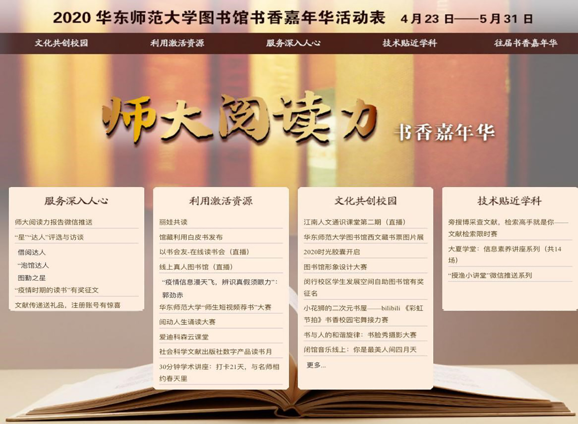 图书馆“书香嘉年华”通过“服务深入人心”、“利用激活资源”、“文化共创校园”、“技术贴近学科”四大模块,开展“唐诗与中国人性精神”以书会友·在线读书会、“想念图书馆”心情故事征文、 “师生短视频荐书”大赛等丰富多样的活动为同学们带来独具特色的“师大阅读力”。
