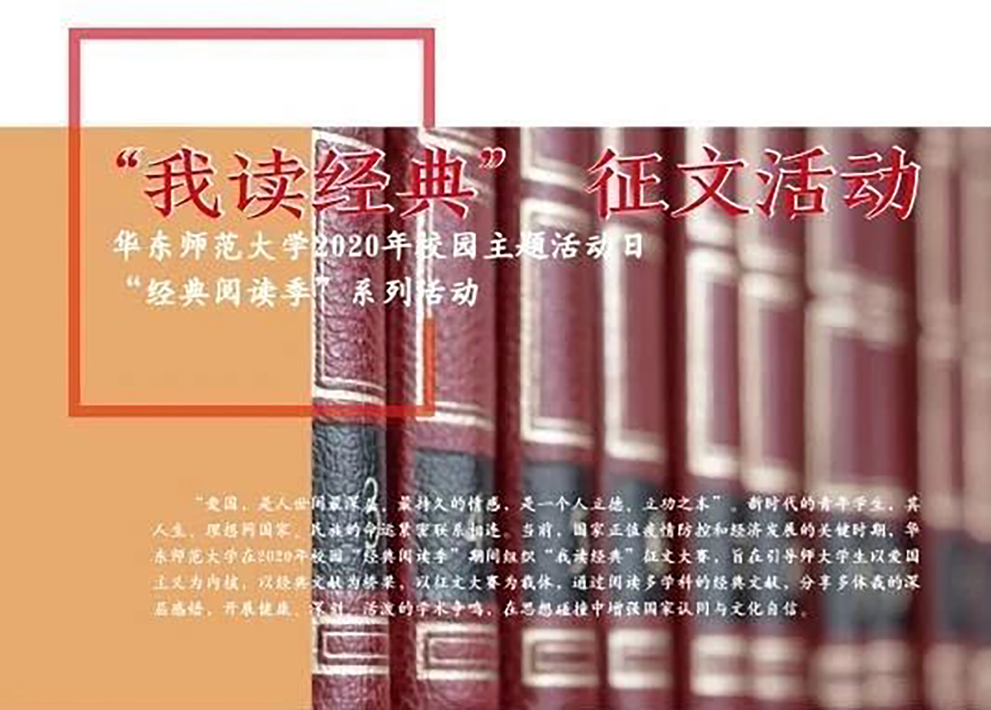 4月,我校举办“经典阅读”校园主题活动日暨“经典阅读季”系列活动。本次校园主题活动日以“经典阅读涵育爱国情怀”为主题,结合年初以来发生至今的新冠肺炎疫情防控和经济形势变化,通过开展“丽娃•樱桃”爱国主义名篇云诵会、ECNU经典荐读书目校园推广与导读活动、中外爱国主义经典电影音乐线上赏析活动、图书馆“书香嘉年华”等活动,倡导校园阅读风尚,引导学生阅读经典作品汲取爱国主义精神力量,教育学生准确把握新时代爱国主义精神丰富内涵,加强新时代爱国主义教育的氛围营造和文化浸润。校园主题活动以师生共读经典的形式,延伸和创新思政课堂,提升文化育人实效。