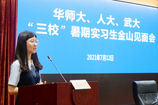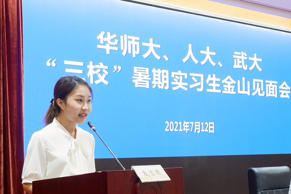 金山区在早在2005年开展了储备人才计划,2019年启动选调生招录工作,为吸引人才建设金山区提供了重要支持。金山区选调生代表张俊介绍了自己扎根张堰镇百家村的工作经验,向大家分享了三点真切的体会和经验:一是用好知识、持续学习,二是实事求是、写实材料,三是找准定位、砥砺奋斗。他期望同学们能勇于直面困难,发扬创业精神,将选调生作为奋斗终身的事业。储备人才代表李涤凡介绍了金山区储备人才项目并分享自己参与该项目的收获与成长,她期待同学们尽早进入工作状态和适应工作环境,坚持多动手多动脑多请教,积极参与到实践中去,争取做到“为者常成,行者常至”。中国人民大学学生代表王家齐也表示,她怀着“追寻初心、锻炼自己”的愿望来到金山参加暑期实习,感受到金山区委的精心组织和安排所带来的温暖,表示要珍惜本次实习的机会,将所学知识与实践联系在一起,不断提高自己的综合素质,“立鸿鹄志,做奋斗者”,不忘初心使命,传承红色精神。