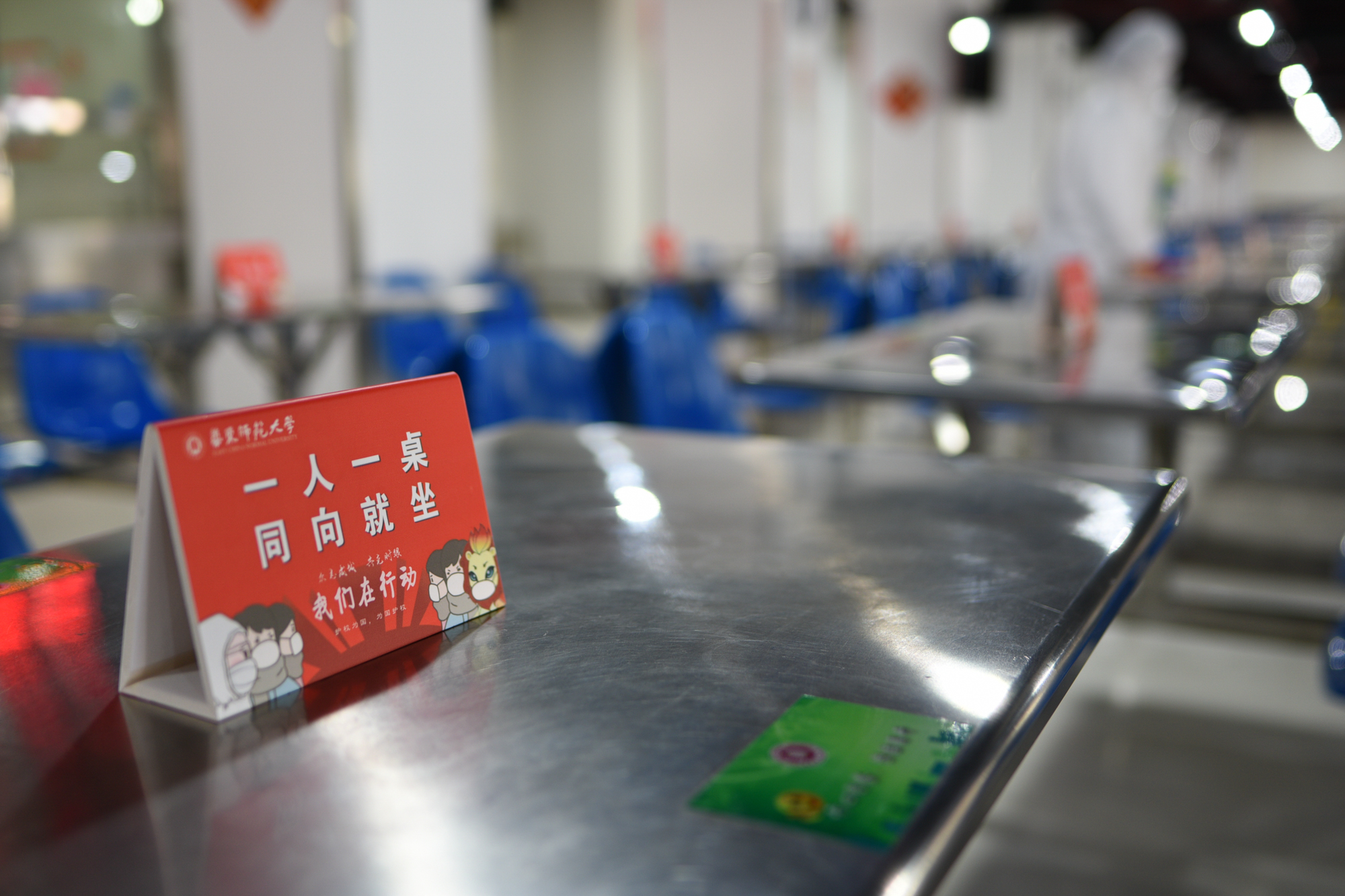 整齐摆放的“一人一桌,同向就坐”餐桌提示,近半米高的“一字”隔离板,在食堂入口处,学生进行手部消毒,测温合格后,方可进入食堂,醒目的提示和隔离板,提醒同学们注意间隔就坐用餐。