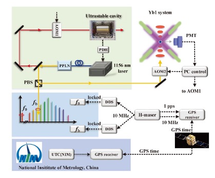 图2:(a)冷镱原子光钟绝对频率测量示意图;