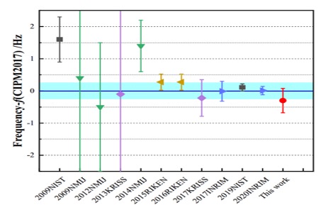 (b)国际上镱原子光钟小组绝对频率测量值汇总,其中红色点表示徐信业教授课题组的测量值