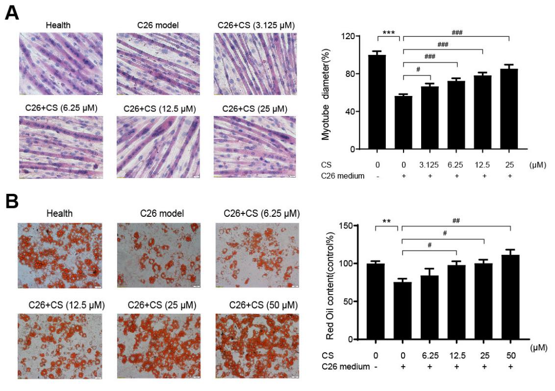 图1. CS体外缓解C26细胞培养液上清诱导的C2C12肌管萎缩和3T3-L1脂肪细胞脂解。A. CS作用后C2C12肌管H&E染色。B. CS作用后3T3-L1脂肪细胞油红O染色。