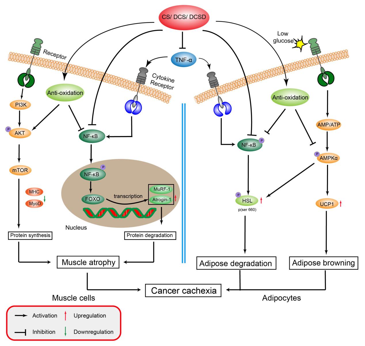 图3.CS及其类似物缓解肿瘤恶病质肌萎缩与脂肪降解分子机制示意图