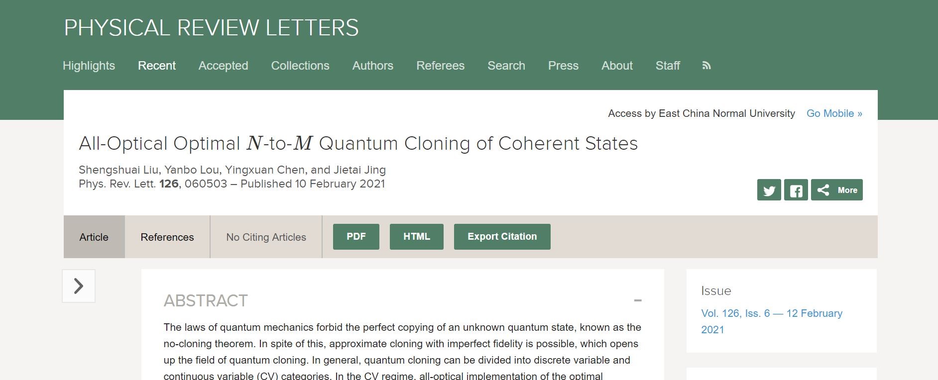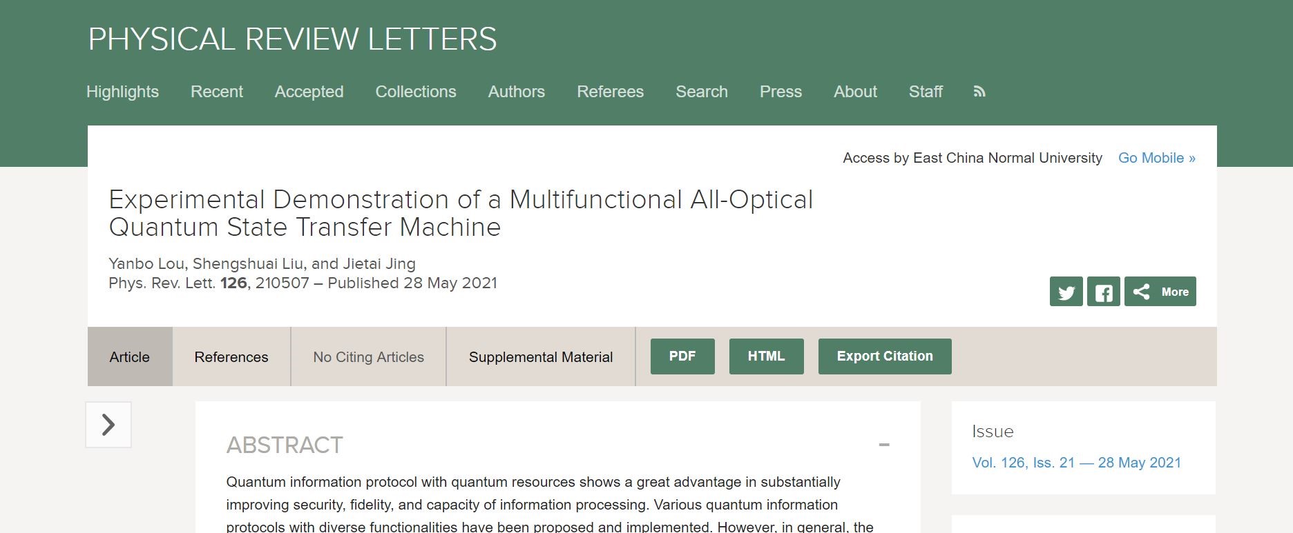 近期,3245澳门新莆京精密光谱科学与技术国家重点实验室荆杰泰教授团队在量子信息领域连续取得重要进展,两项相关研究成果相继发表于国际物理学重要学术期刊《物理评论快报》(Physical Review Letters 126, 060503 (2021) 以及Physical Review Letters 126, 210507 (2021))。量子信息协议利用量子资源突破经典信息处理方式,从而实现高容量、高保真度以及高安全性的新型信息处理。荆杰泰教授团队长期致力于发展新型量子光源及其在量子信息科学中的应用研究。该团队近期连续取得的两项科研成果聚焦于提升量子信息协议的信息处理保真度,分别在实验上实现了全光学最优化N→M量子克隆和多功能全光量子态传输机,研究了这两种量子信息协议中信息处理保真度提升的机制。
