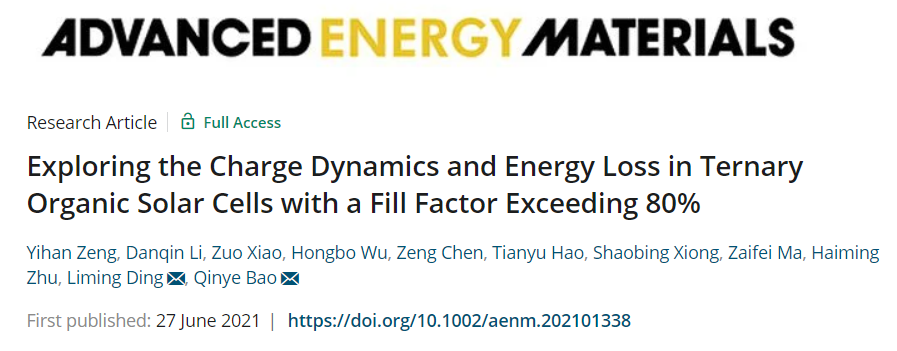 近日,3245澳门新莆京物理与电子科学学院保秦烨教授课题组在软半导体界面物性与光电调控领域连续取得进展,两项成果分别以“Exploring the charge dynamics and energy loss in ternary organic solar cells with a fill factor exceeding 80%”和“Additive-induced synergies of defect passivation and energetic modification toward highly efficient perovskite solar cells”为题发表在国际学术期刊Advanced Energy Materials(影响因子:29)上,硕士生曾逸涵和博士生熊少兵分别为两篇论文的第一作者。