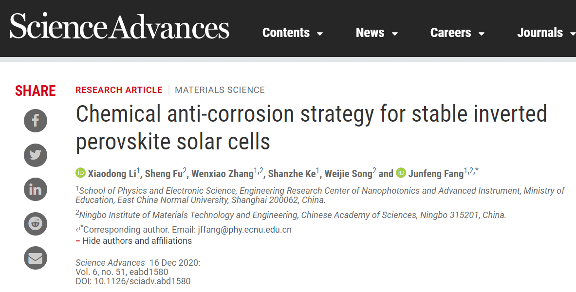 Science Advances刊发方俊锋团队在钙钛矿电池的工作稳定性方面取得重要进展