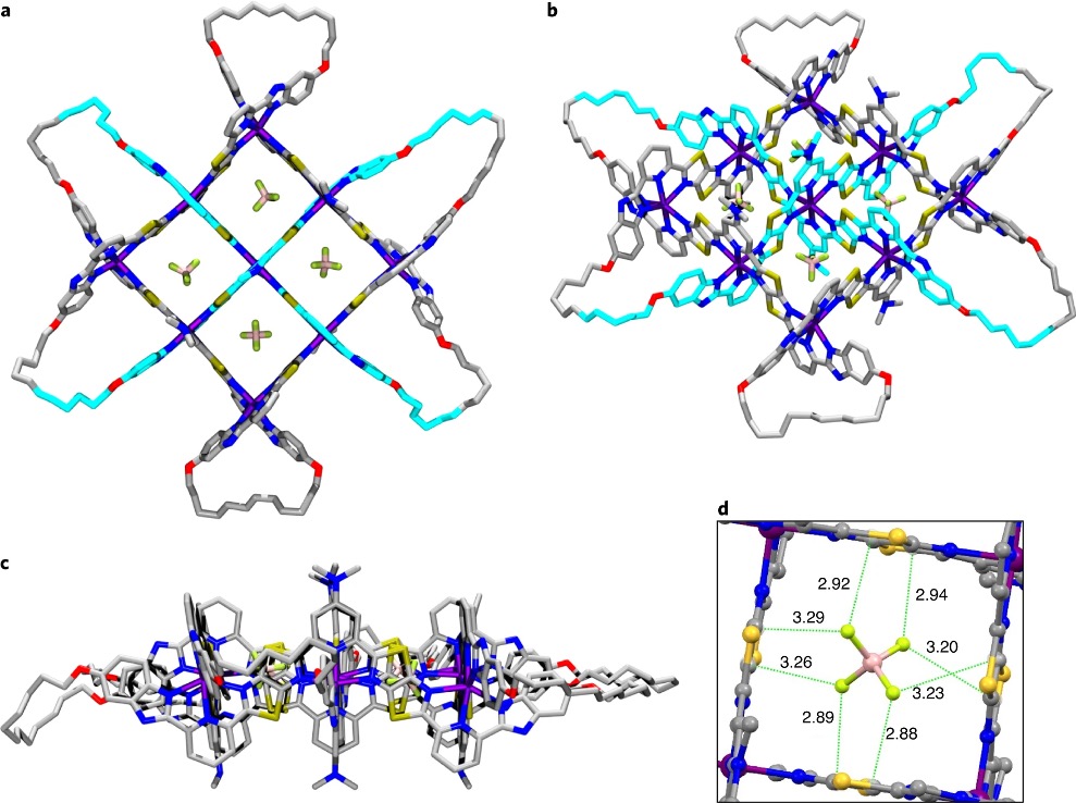 [Fe916](BF4)18单晶的制备是通过将甲苯缓慢扩散到分子网格的丙酮溶液中实现。如图3所示,采用Merck分子力场模拟得到基于[Fe916](BF4)18单晶结构的分子74结模型,证实了该分子结具有3×3网格结构。值得一提的是,只有分子链1的末端烯烃的长度设计得十分恰当,才能在3×3网格中精确实现相邻链端之间关环。研究人员通过烯烃复分解关环反应将相邻末端烯烃连接起来得到分别具有两个、四个和六个配体1的关环产物。通过凝胶渗透色谱法,三种闭环产物被分离纯化,其结构通过质谱和1H NMR谱成功解析。