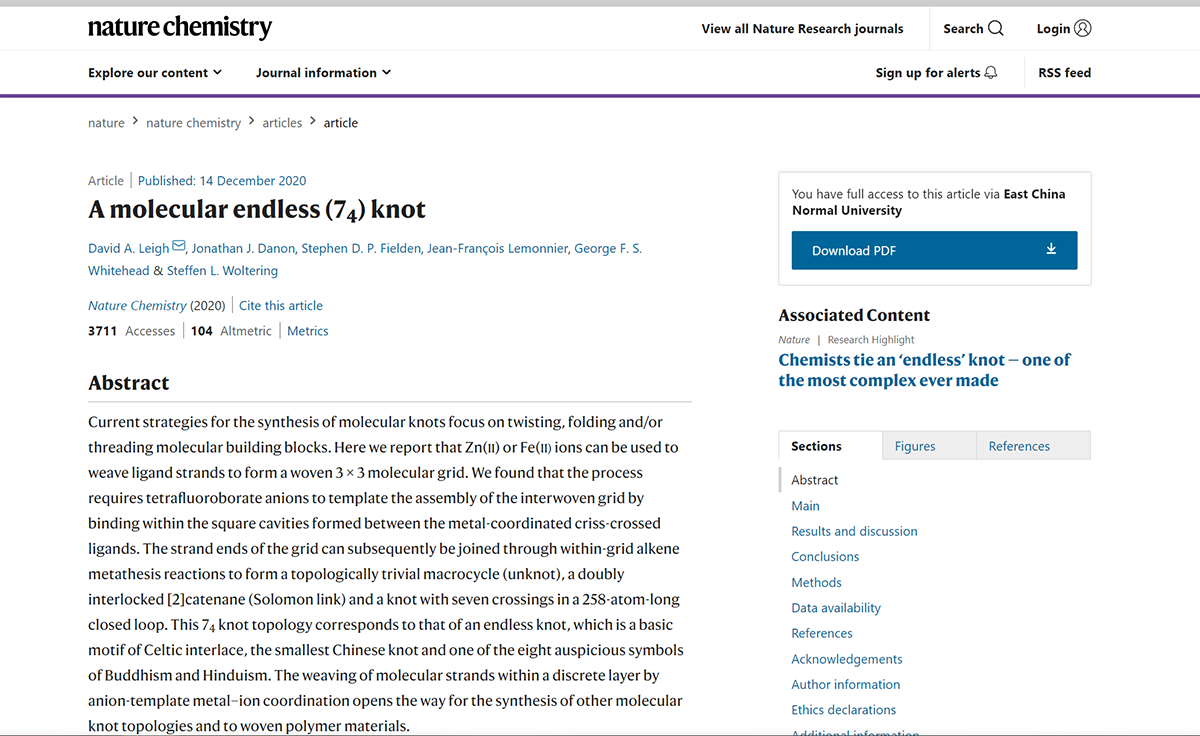 近日,英国皇家科学院和欧洲科学院院士、华东师大化学与分子工程学院特聘教授李大为(David Leigh)在分子拓扑学领域实现新突破。研究团队成功在纳米尺度上编织分子74结,其拓扑结构对应最小的中国结。研究成果以题为“A molecular endless (74) knot”发表在国际著名学术期刊《自然•化学》(Nature Chemistry 2020, DOI: 10.1038/s41557-020-00594-x),3245澳门新莆京为第一单位,李大为教授为通讯作者。