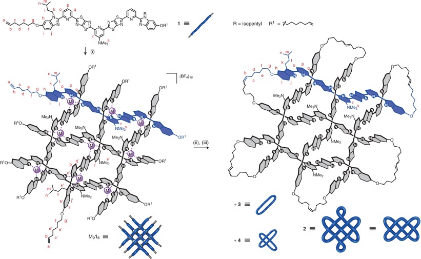 图2 编织3×3网格[Zn916](BF4)18和 [Fe916](BF4)18,大环3,索罗门[2]索烃4和分子74结2的合成