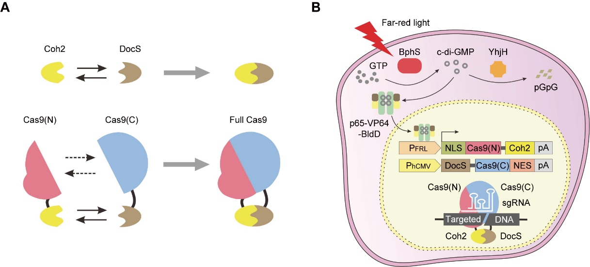 远红光调控的分割型split-Cas9基因编辑系统(FAST系统)的设计原理示意图