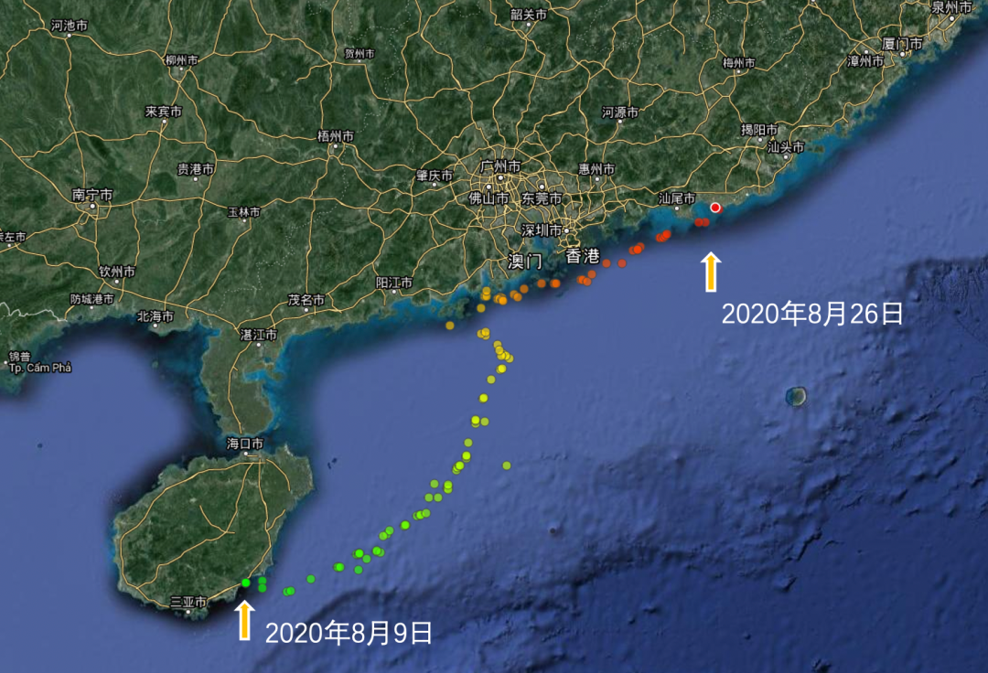 8月9日到8月26日海龟发回的卫星信号轨迹