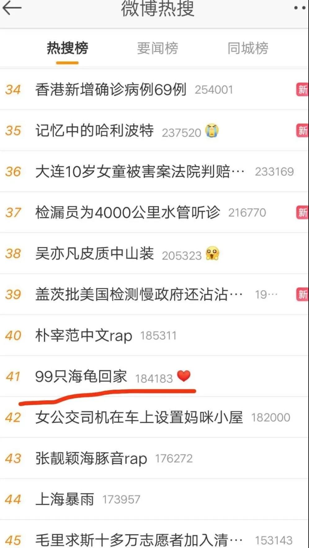 “希望它们以后都能在大海里自由自在的生活,保护每一种海洋精灵!”“龟龟很欢腾,游得真快啊!” “还能玩一次滑滑梯”……当天,99只海龟放归大海的新闻和视频迅速登上微博热搜榜,海龟欢乐的入海姿态引起网友们围观和赞叹!
