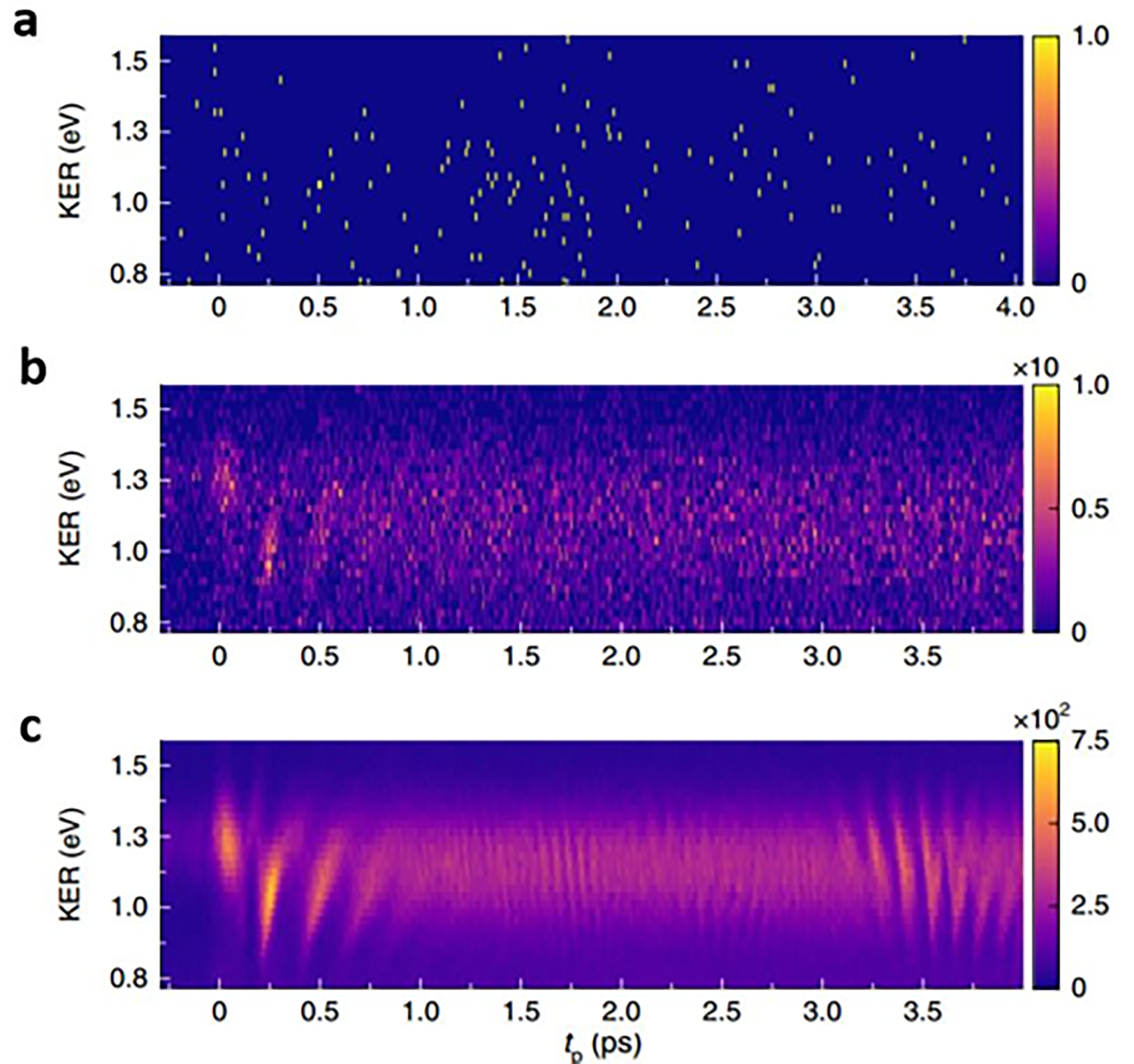 图a-c|单个氩二聚体分子的振动波包随时间的自由演化,在时间轴上呈现出与单粒子双缝衍射实验类似的干涉条纹结构
