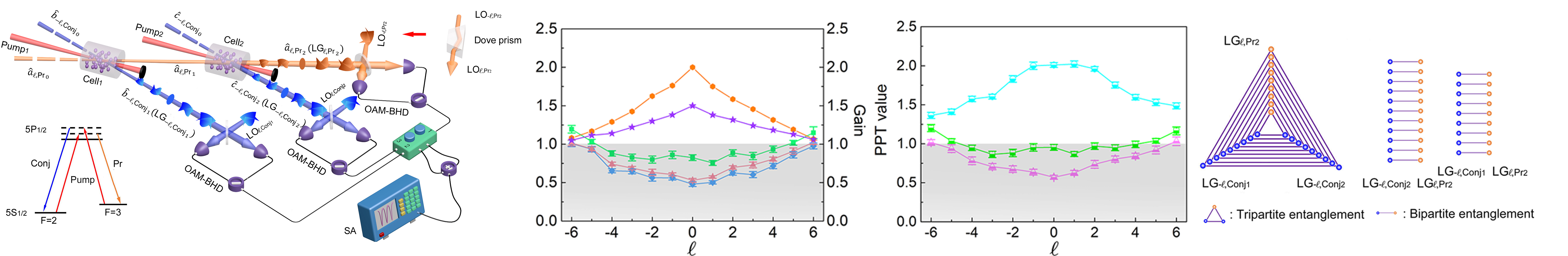 在实验中,该团队利用热原子系综中的级联四波混频过程产生了三光束的纠缠态。在这三束光通道中,系统同时确定性地产生了9组三光束纠缠的拉盖尔高斯(Laguerre-Gaussian,LG)模式和20组两光纠缠的LG模式。此外该工作还验证了系统中对三光束其中一束的拓扑荷数l进行符号变换后三束光不存在纠缠,从而证明了该级联四波混频过程中,非线性相互作用遵守光学轨道角动量守恒定律。该工作还研究了四波混频系统中三种不同类型的光学轨道角动量相干叠加模式情况下的三光束量子纠缠特性,多方面展示了系统丰富的纠缠结构。这项成果以“Deterministic Generation of Orbital-Angular-Momentum Multiplexed Tripartite Entanglement”为题,以3245澳门新莆京精密光谱科学与技术国家重点实验室为第一完成单位,博士研究生李思瑾与潘晓州为论文共同第一作者,荆杰泰教授为论文通讯作者,于2020年2月28日发表在《物理评论快报》(Physical Review Letters 124, 083605 (2020))上。
